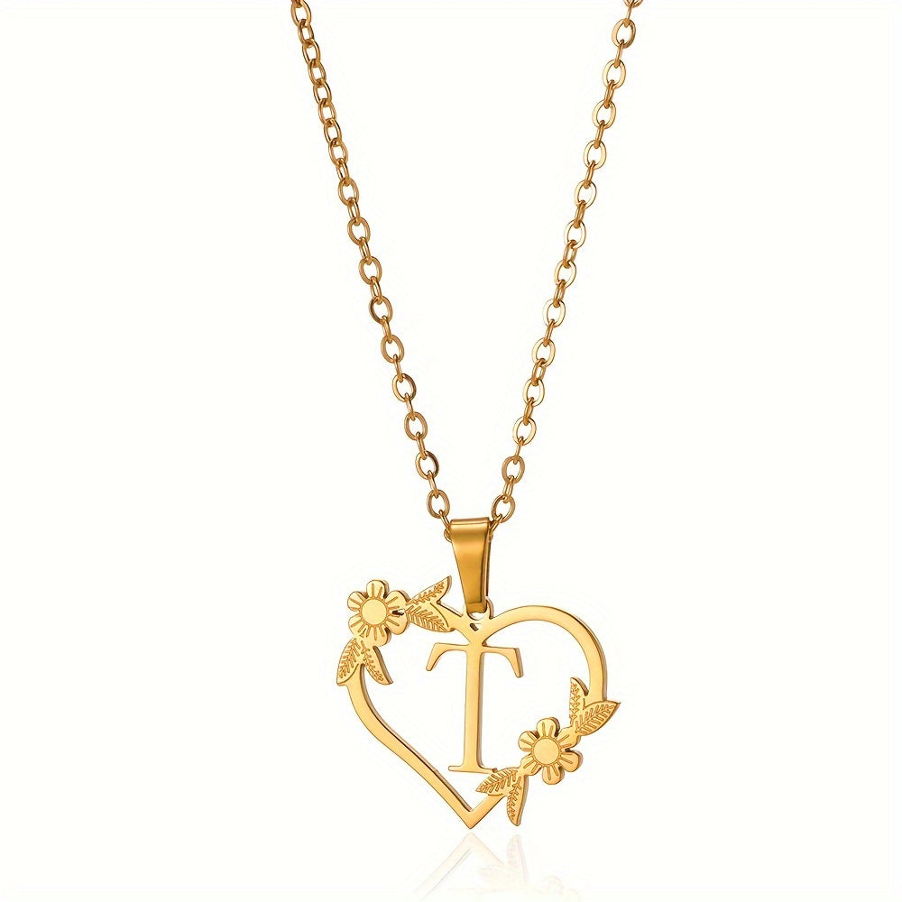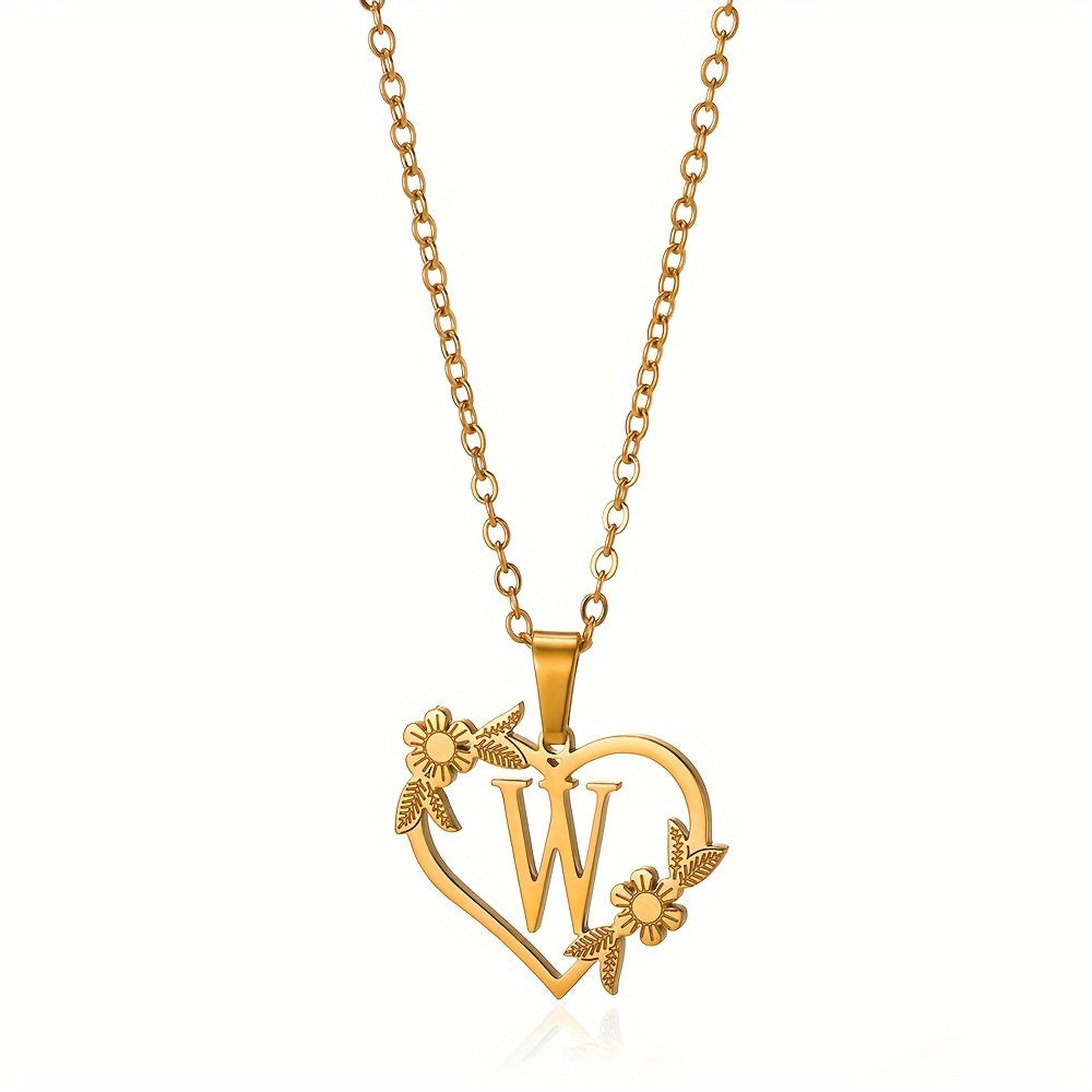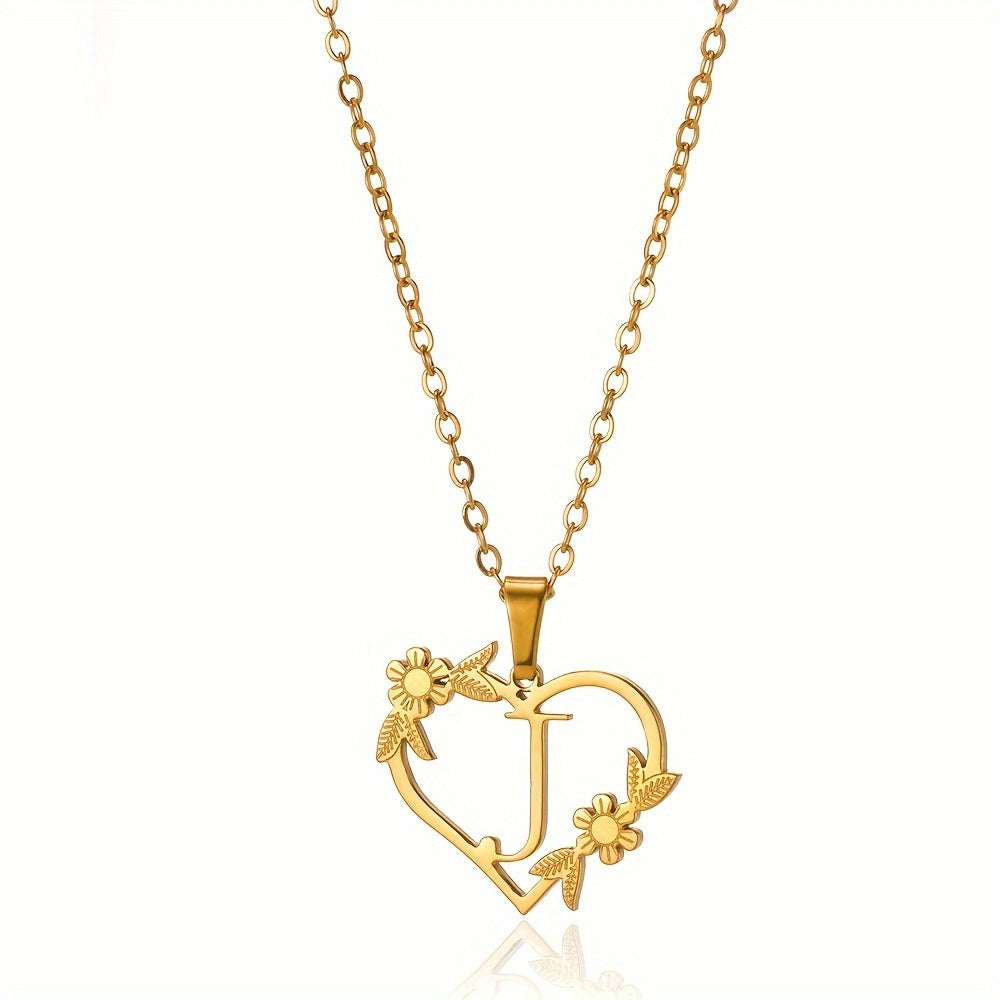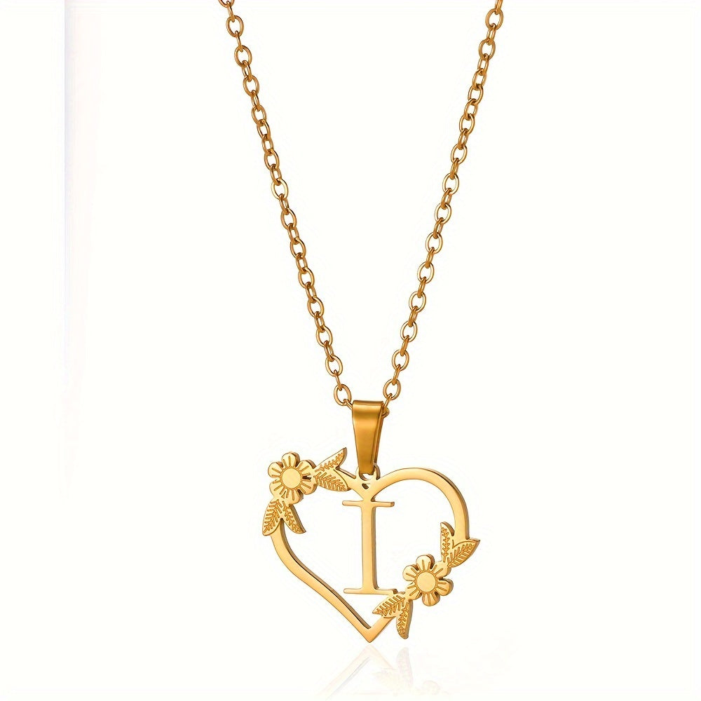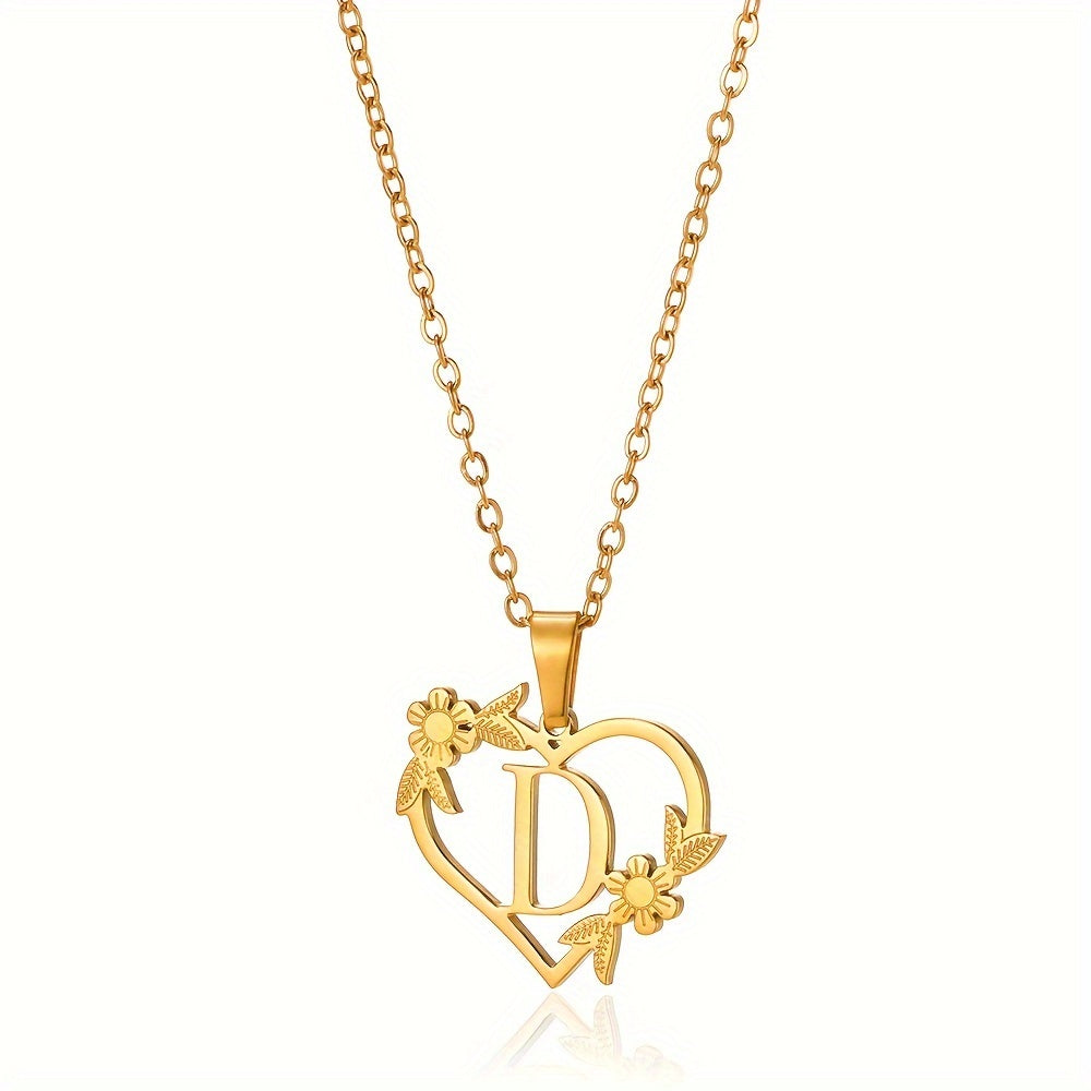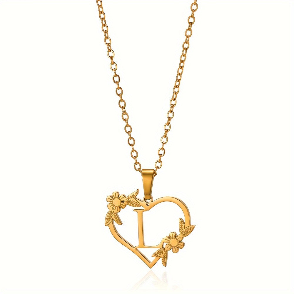 قلادة على شكل قلب مزينة بزهرة مطلية بالذهب عيار 18 قيراطًا من الفولاذ المقاوم للصدأ لتزيين العنق