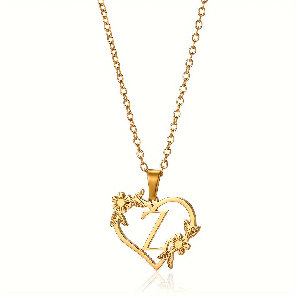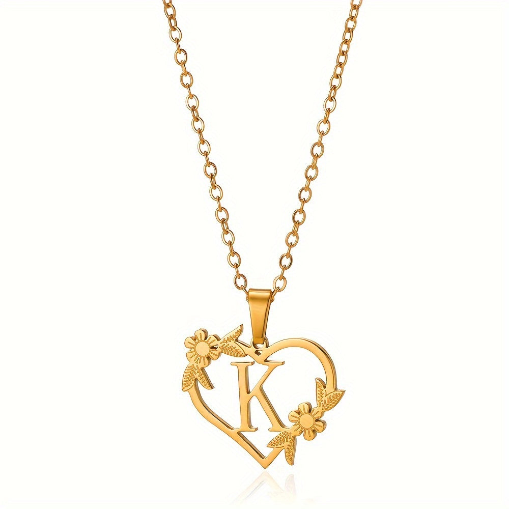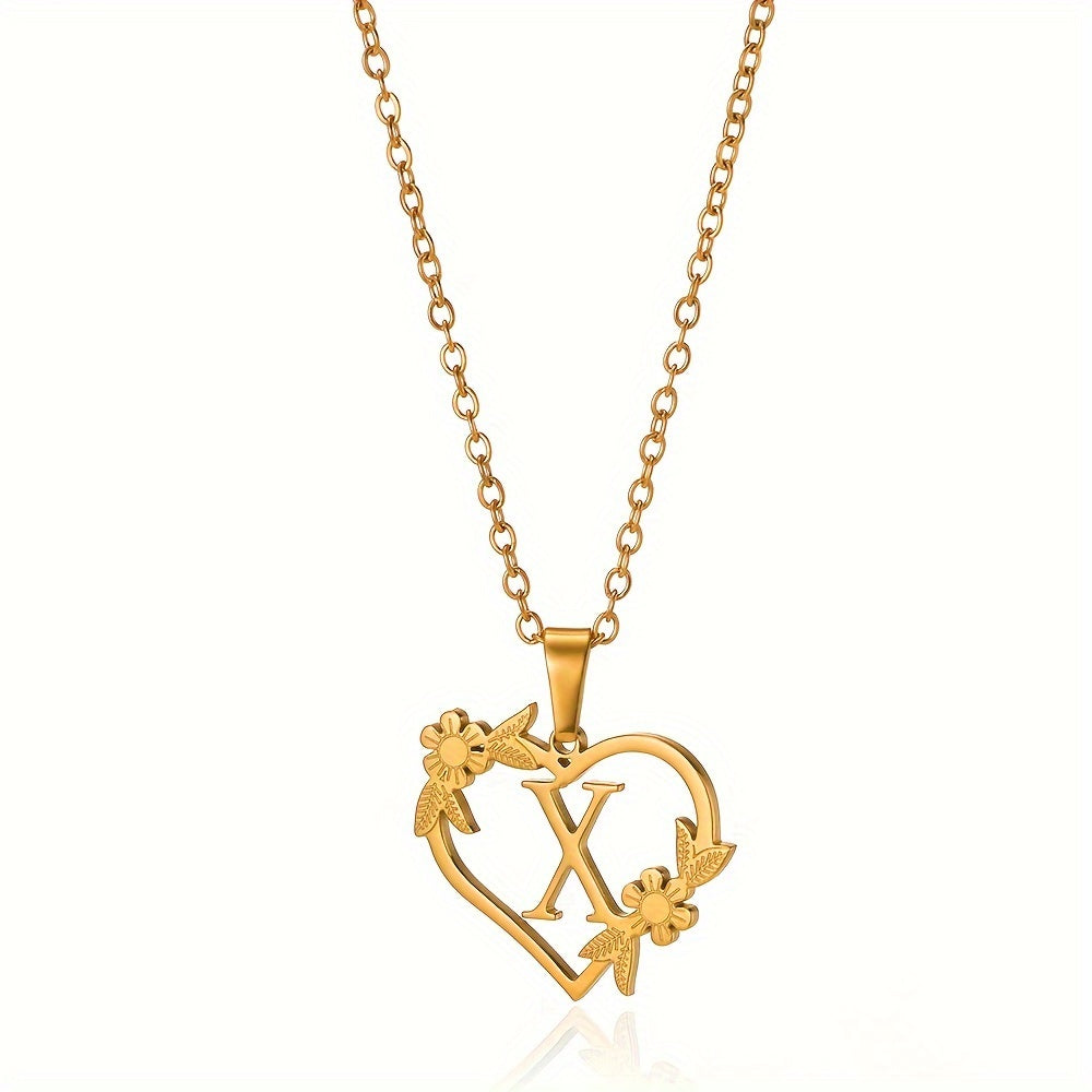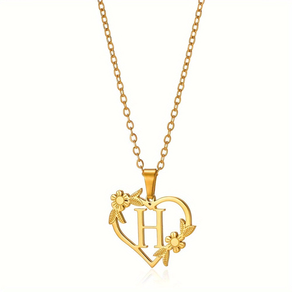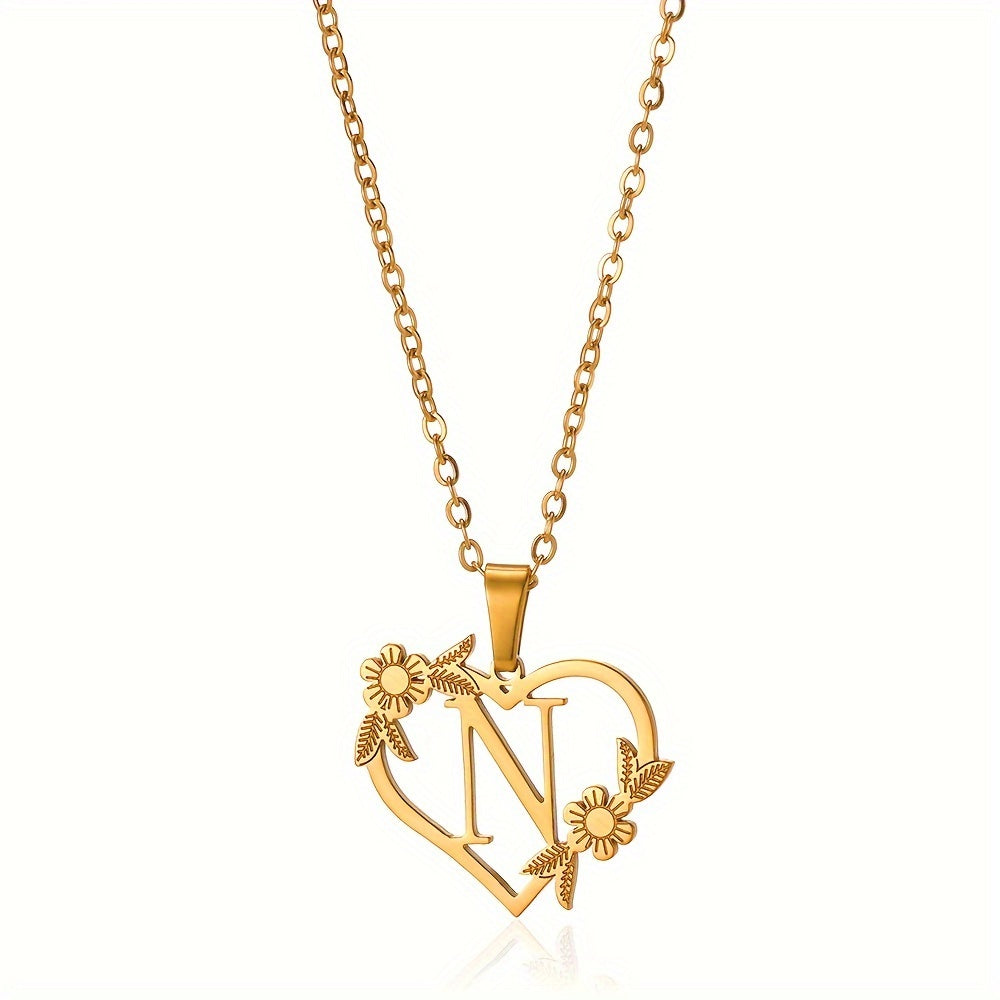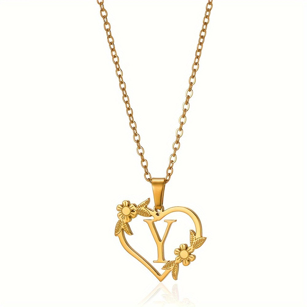 قلادة على شكل قلب مزينة بزهرة مطلية بالذهب عيار 18 قيراطًا من الفولاذ المقاوم للصدأ لتزيين العنق