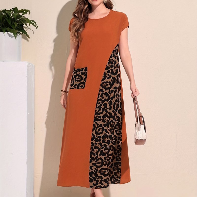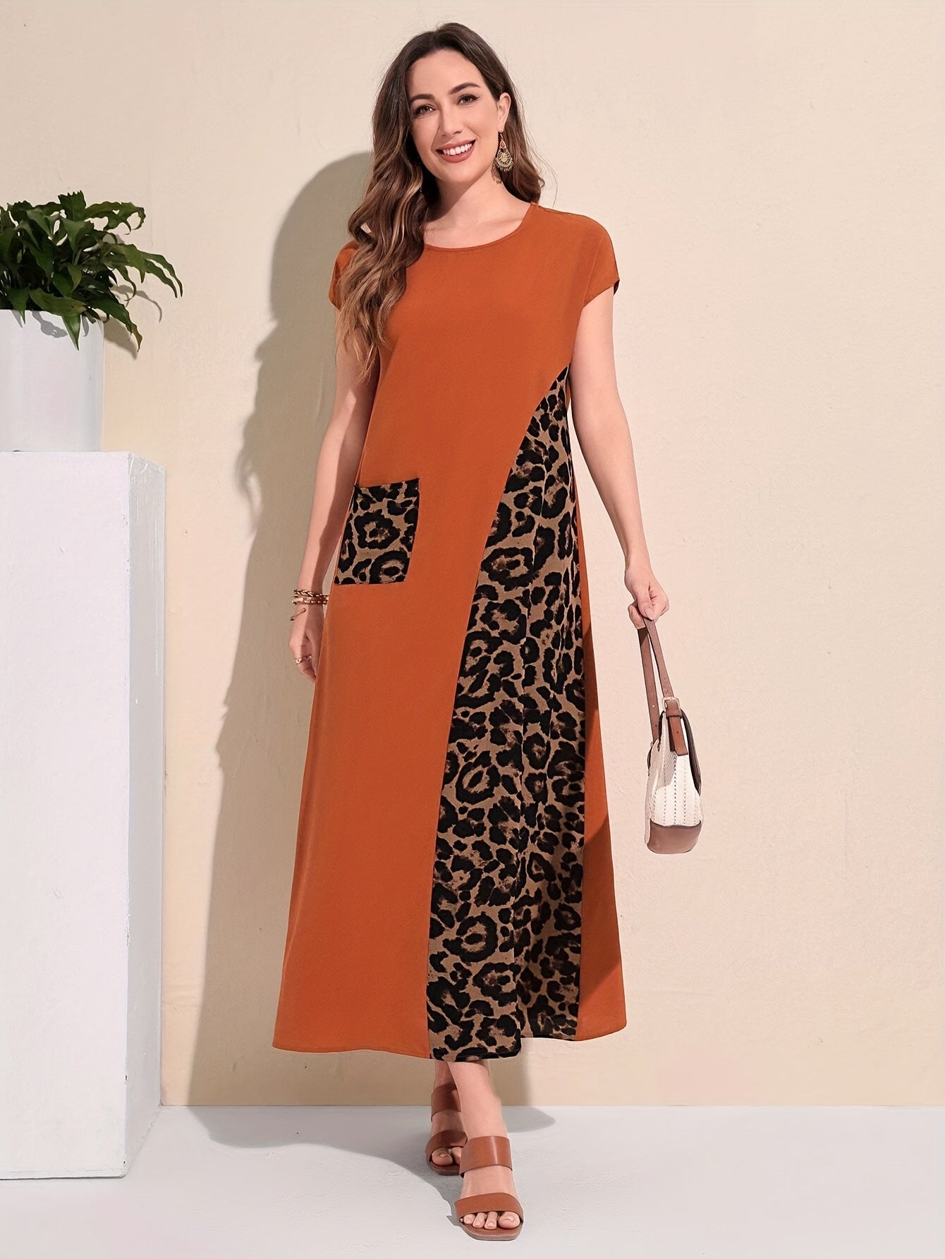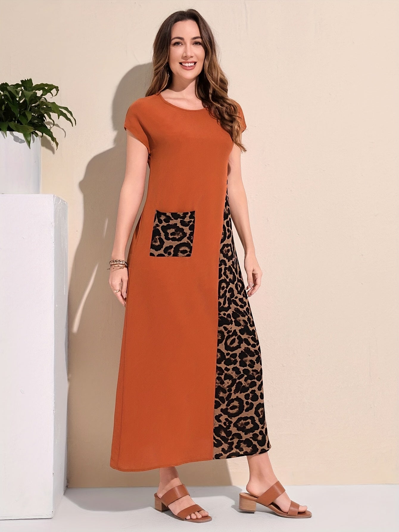 Increase quantity for فستان رقبة طاقم الفهد المتباين، فستان أنيق بأكمام قصيرة للربيع والصيف، ملابس نسائية
