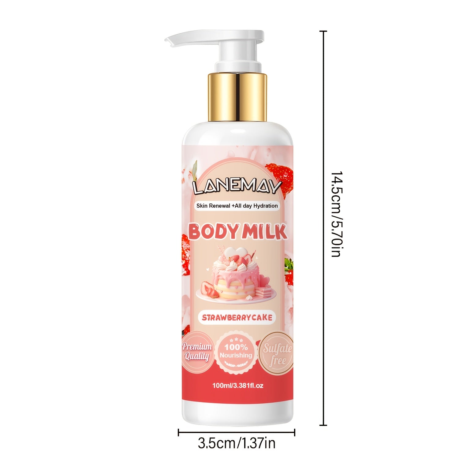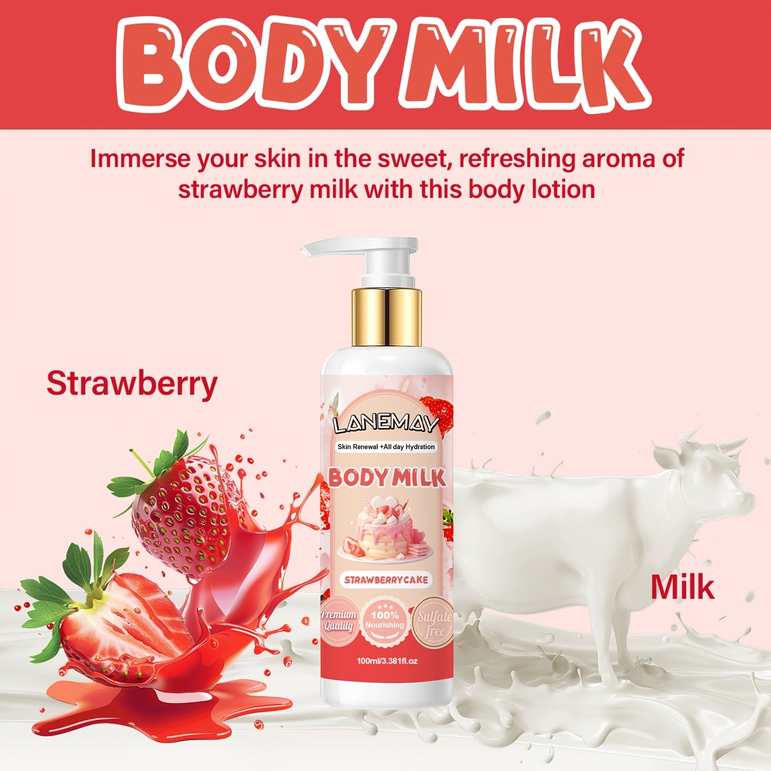 لوشن الجسم المرطب بلانيماي بالفراولة والحليب - يغذي البشرة بعمق وينعمها، غني بفيتامين E، مضاد للحساسية لجميع أنواع البشرة، 100 مل
