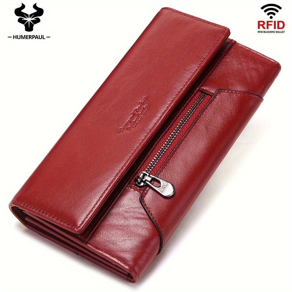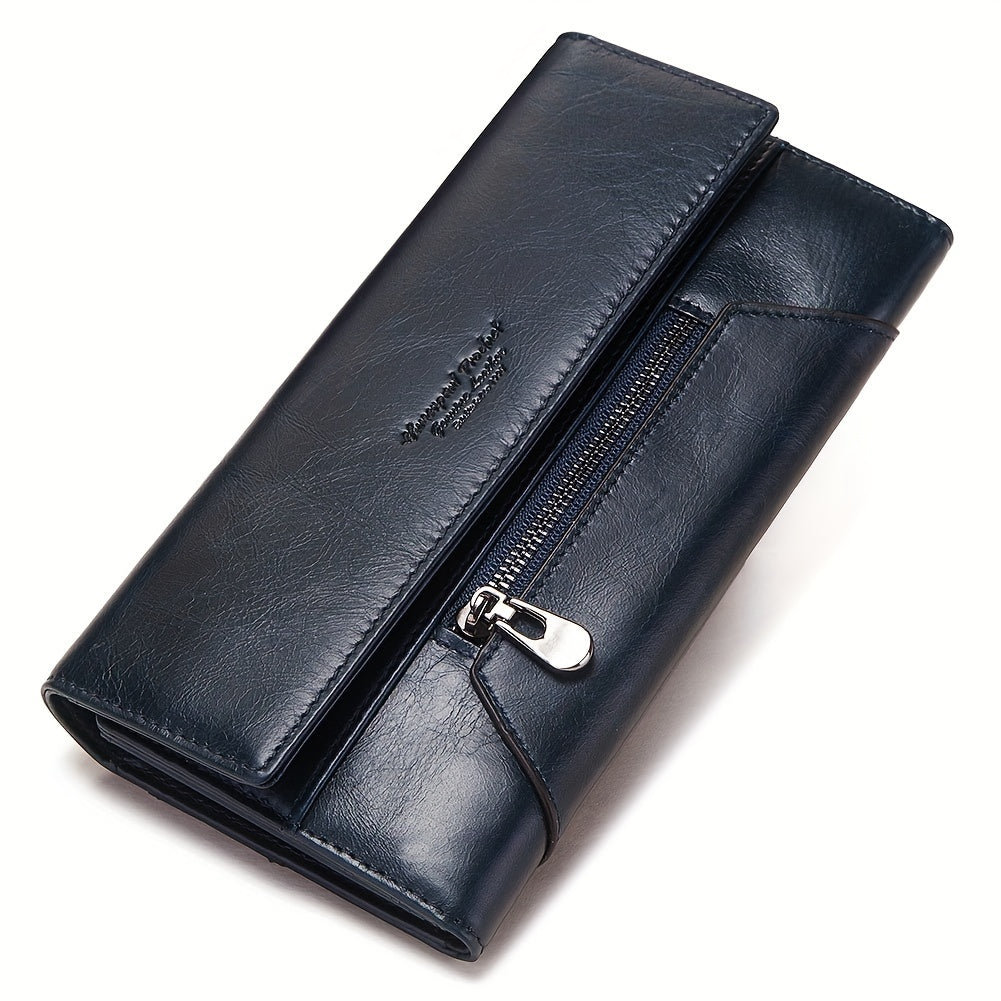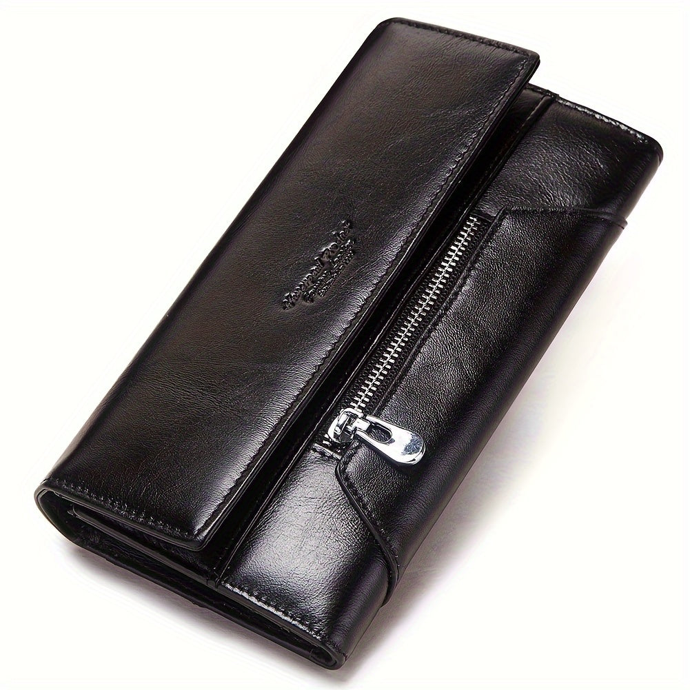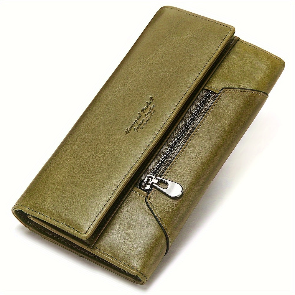 محفظة نسائية أنيقة من الجلد الطبيعي، تصميم بسيط بتقنية RFID لحماية البيانات، يُغسل يدويًا، إغلاق بزر وجيب بسحاب، جيوب لبطاقات الائتمان، بطانة من البوليستر - مصنوعة في غوانغتشو