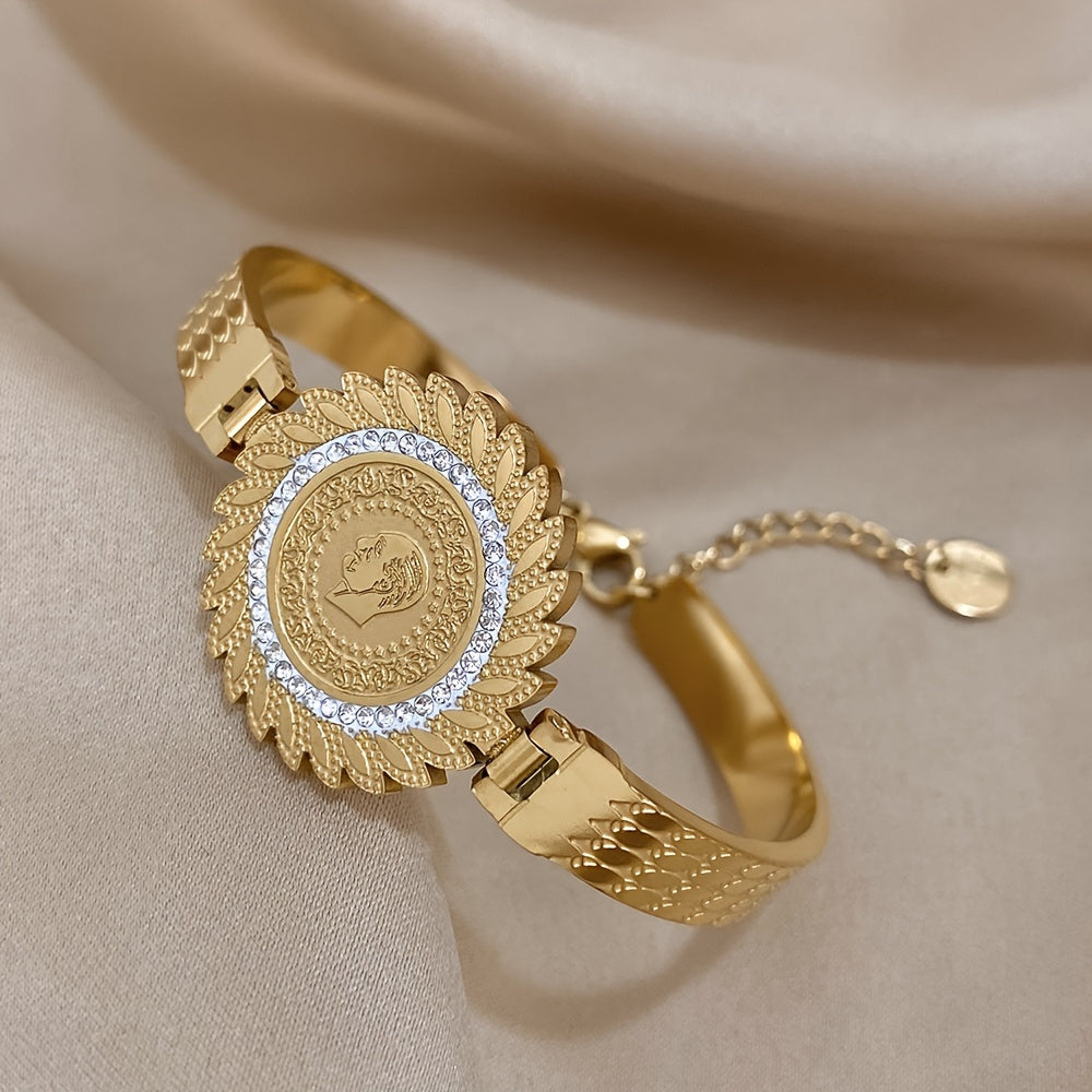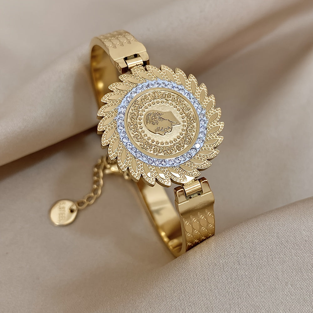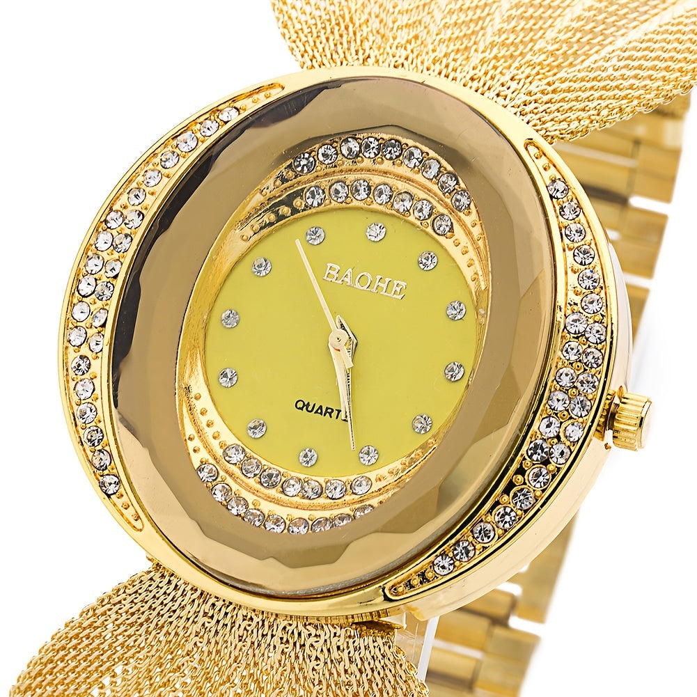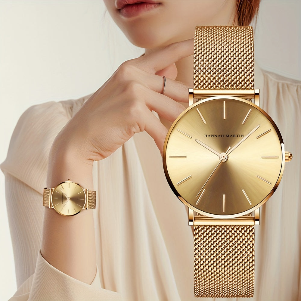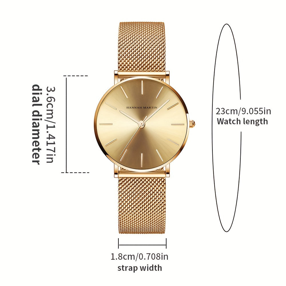 ساعات كوارتز ذهبية بسوار من الفولاذ المقاوم للصدأ ومؤشر من سبائك الصلب ومينا من الفولاذ المقاوم للصدأ للنساء هدايا العيد