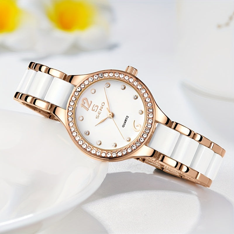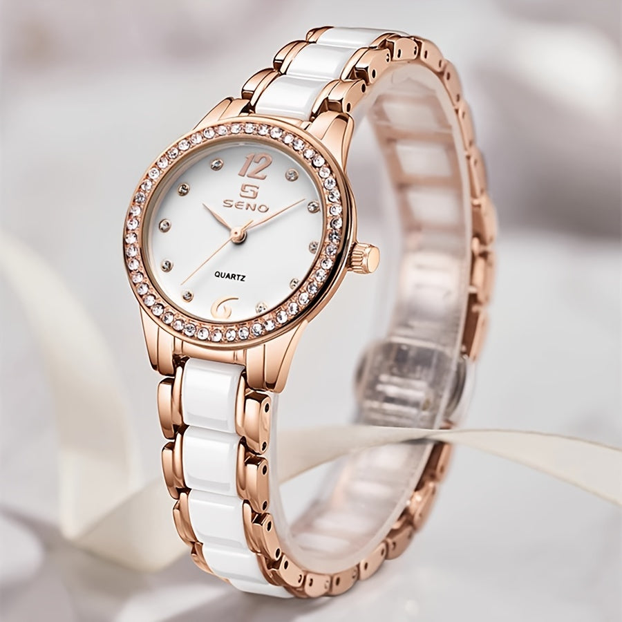 ساعة سينو النسائية الفاخرة بحجر الراين كوارتز ساعة يد سيراميك عصرية تناظرية للسيدات-S034