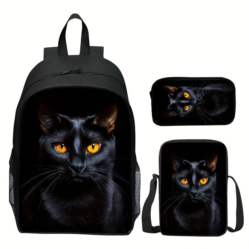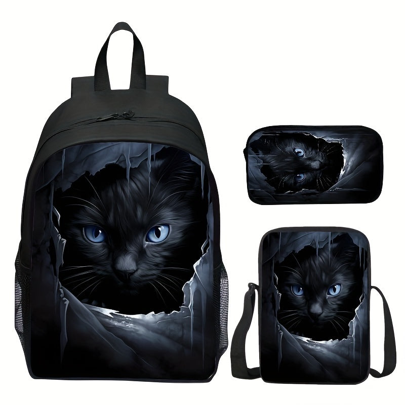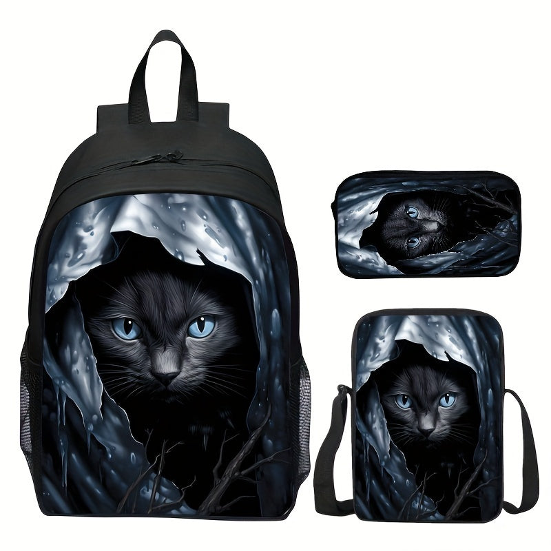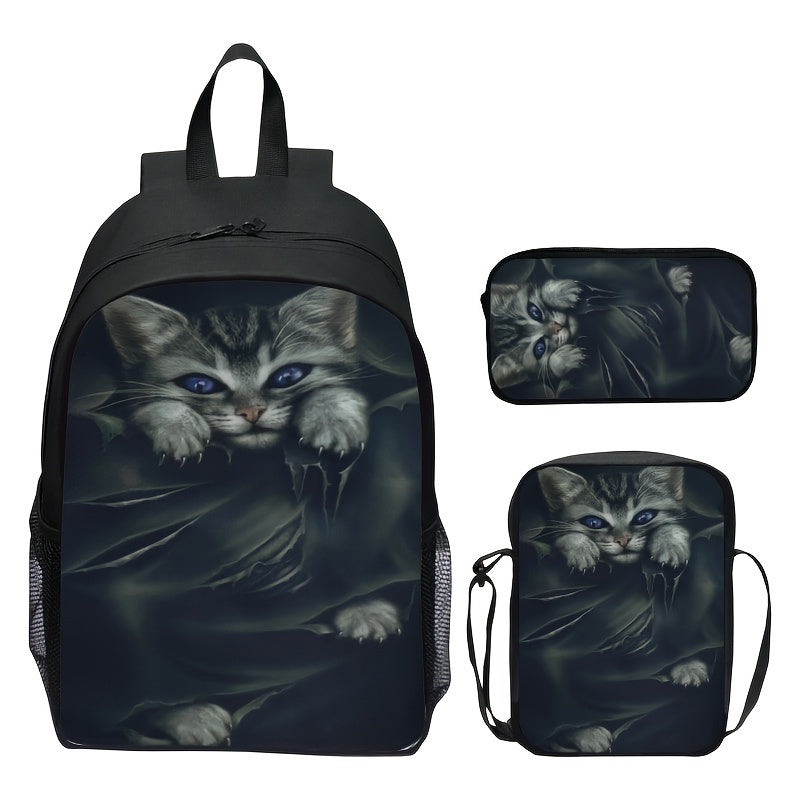Decrease quantity for 3pcs/set حقيبة ظهر طباعة قطة ثلاثية الأبعاد لطيفة ، حقيبة مدرسية جامعية مسبقة الإعداد للسفر ، حقيبة كتف وحقيبة قلم للطلاب
