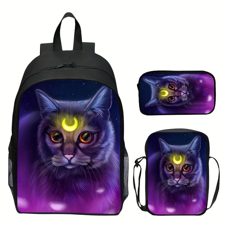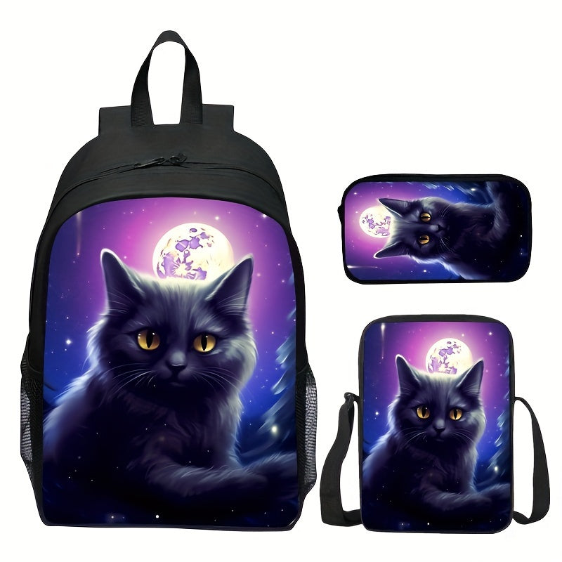 3pcs/set حقيبة ظهر طباعة قطة ثلاثية الأبعاد لطيفة ، حقيبة مدرسية جامعية مسبقة الإعداد للسفر ، حقيبة كتف وحقيبة قلم للطلاب