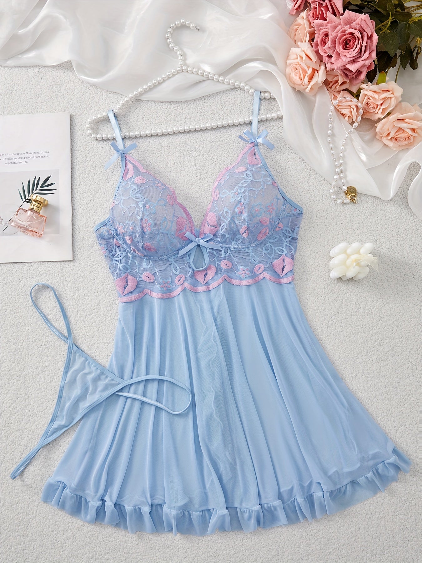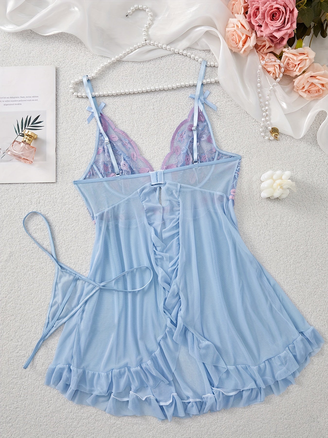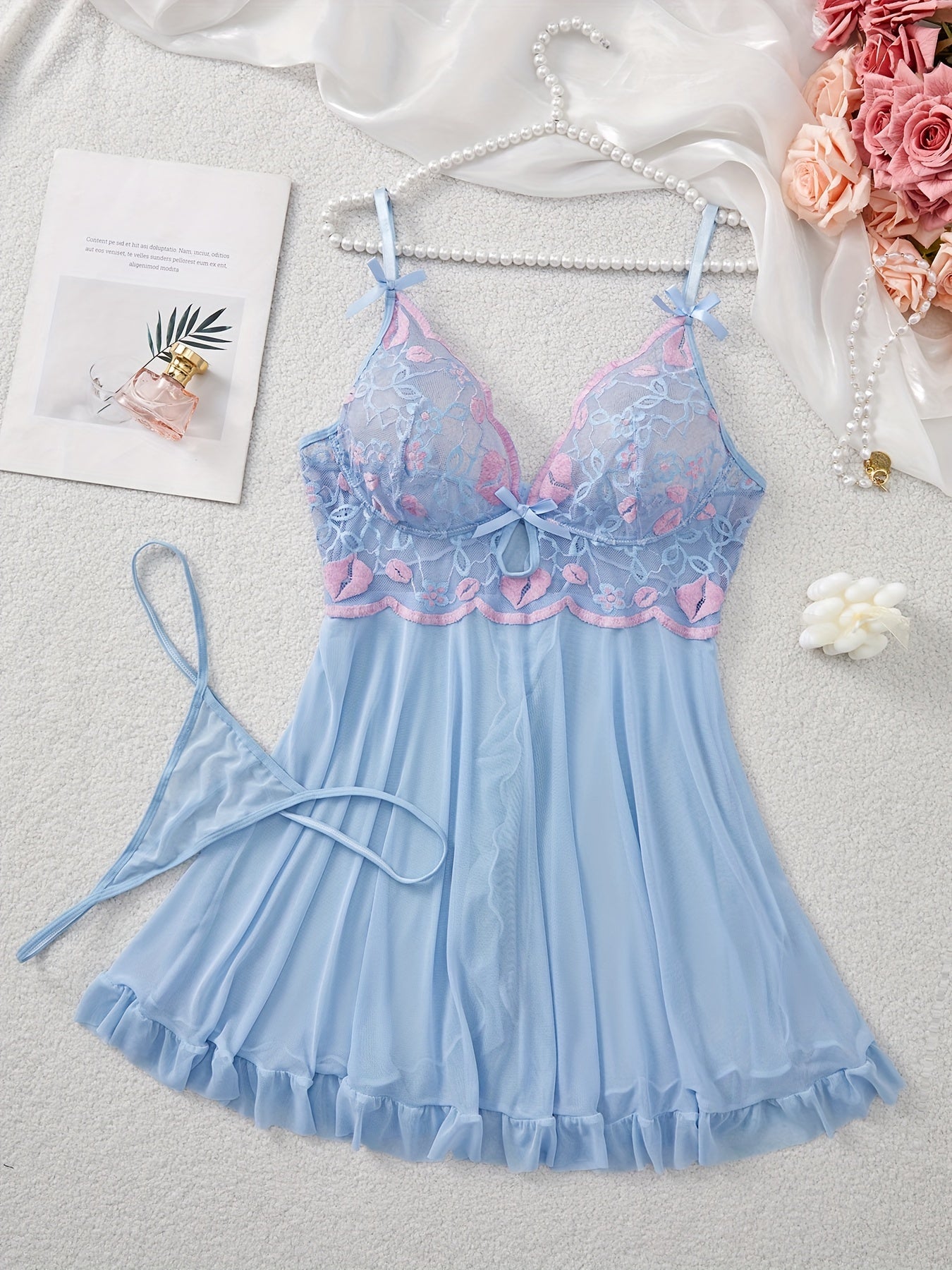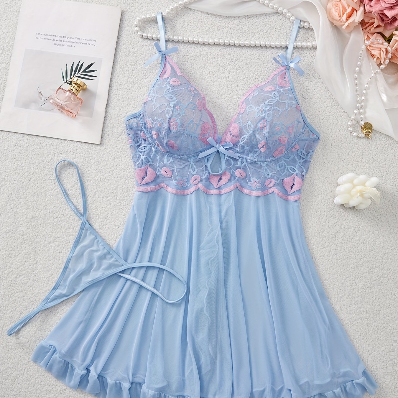 Increase quantity for طقم فساتين داخلية مثيرة للنساء بمقاس كبير، ومقاس كبير، وتطريز قبلة، وتزيين بقوس، وحافة مكشكشة، وقطعة واحدة من ملابس النوم الداخلية وتانغ، طقم من قطعتين.
