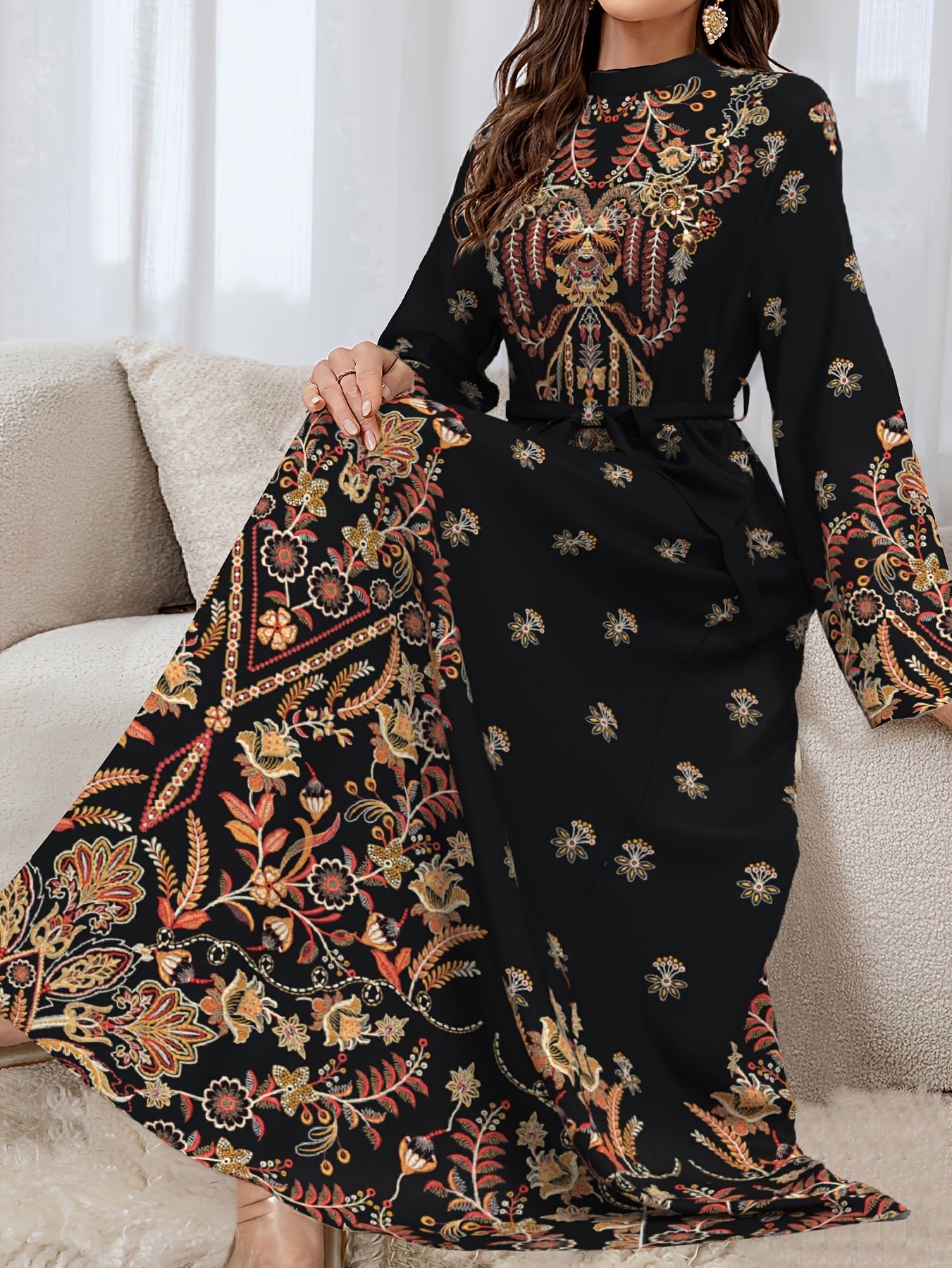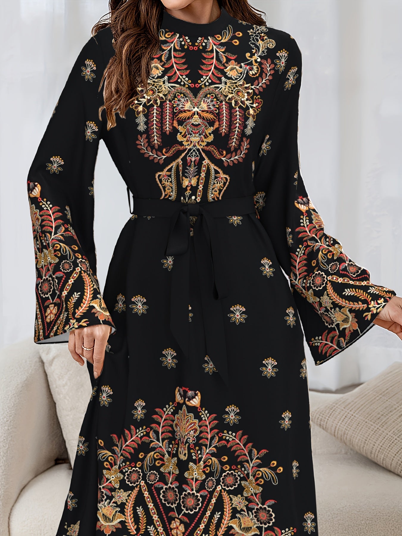فستان أنيق بأكمام طويلة للنساء، يتميز بتصميم شرق أوسطي، مع حزام، مصنوع من القماش، وقابل للغسل في الغسالة