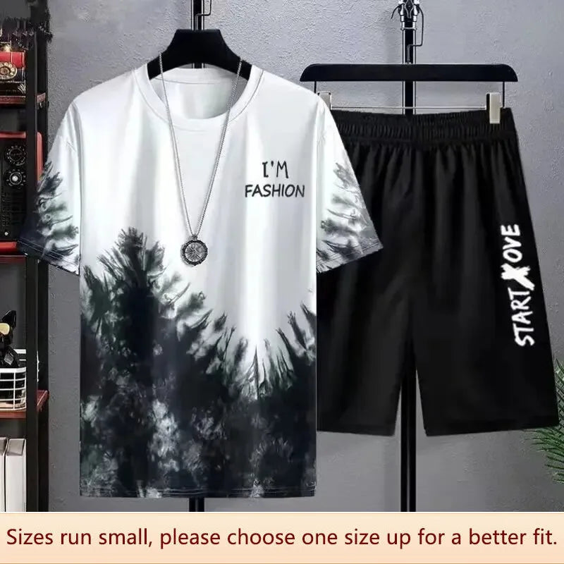 بدلة رياضية كاجوال للرجال صيفي نمط جديد فضفاض من الحرير الجليدي بأكمام قصيرة طقم شورت