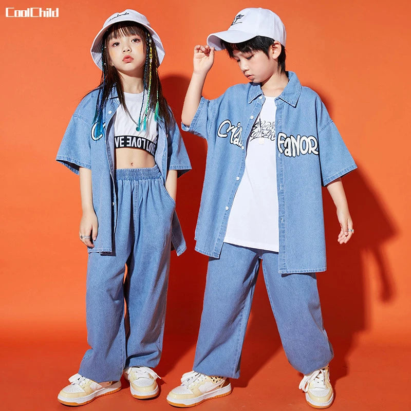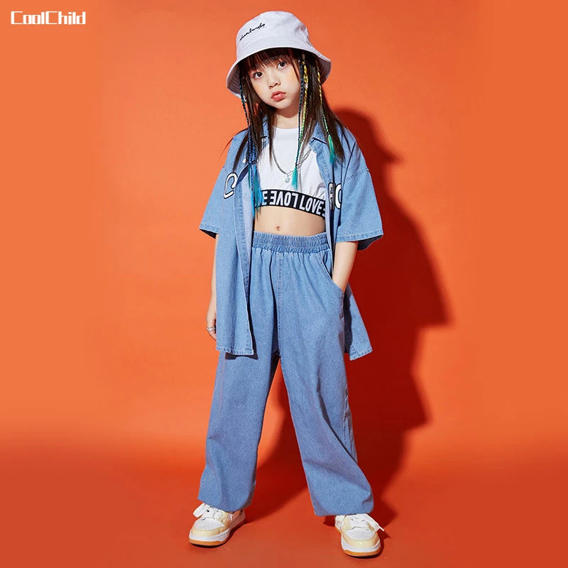 الهيب هوب بنين رسالة سترة الجينز الفتيات قميص الرقص في سن المراهقة الملابس مجموعات الاطفال الشارع الشهير الطفل أزياء الجاز