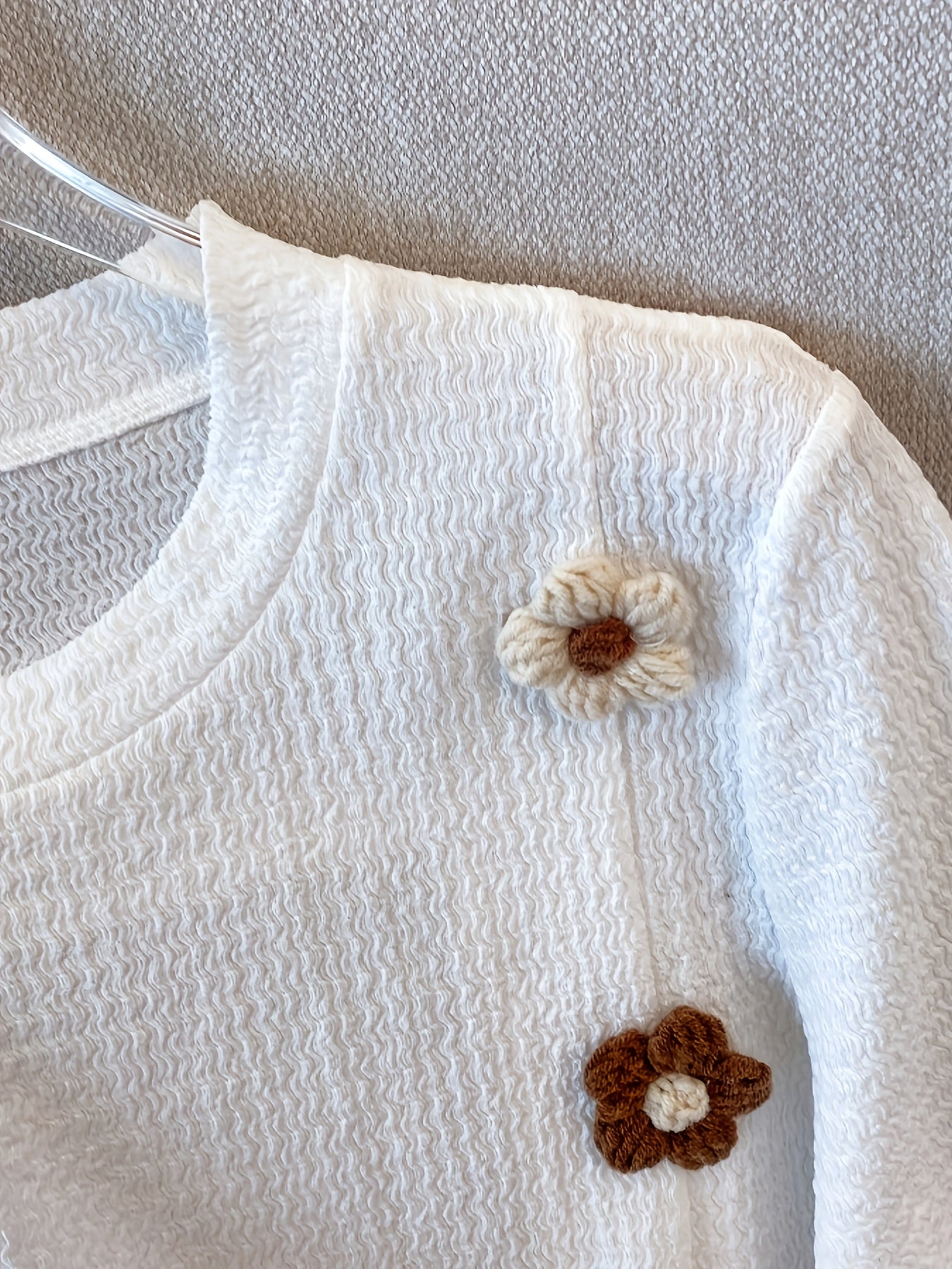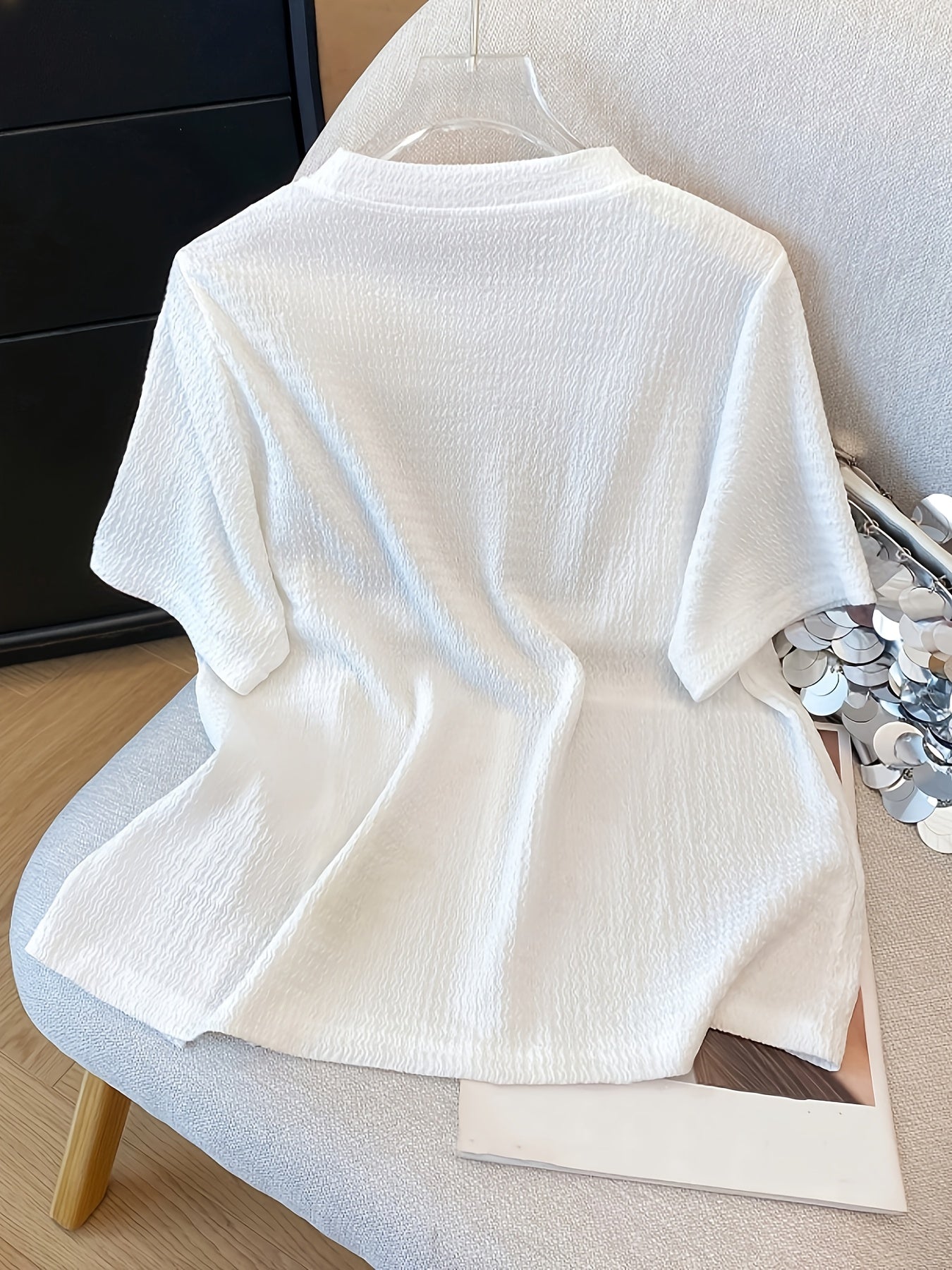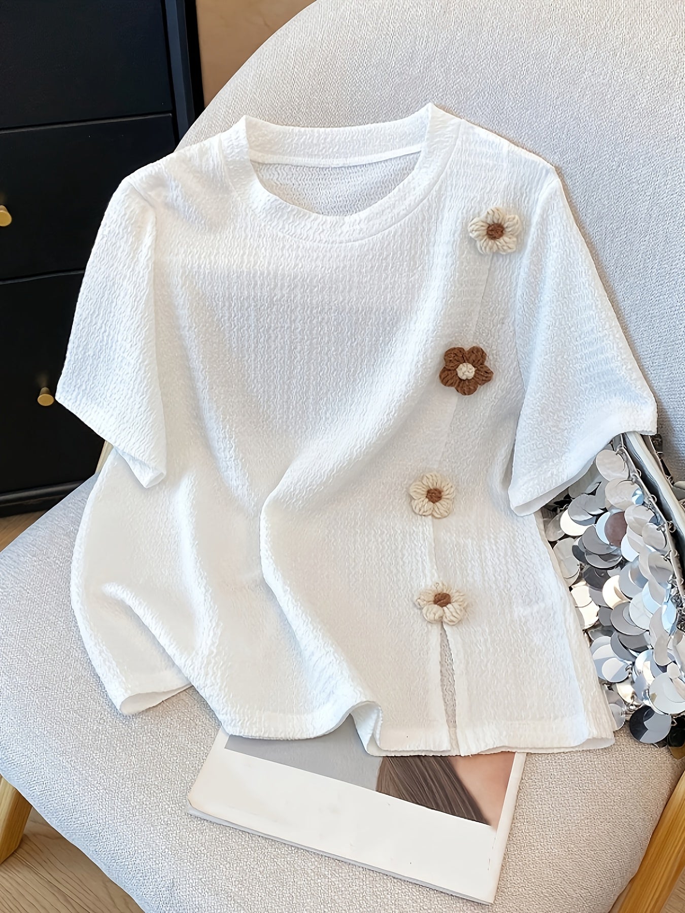 تي شيرت نسائي أنيق مزين بالزهور - نسيج محبوك قابل للتمدد، ياقة مستديرة، أكمام قصيرة، قصة فضفاضة، قمة صيفية/ربيعية/خريفية غير رسمية مع أزرار زهور مزخرفة، قمة صيفية | قميص برقبة مستديرة | بناء محبوك، تي شيرت للنساء