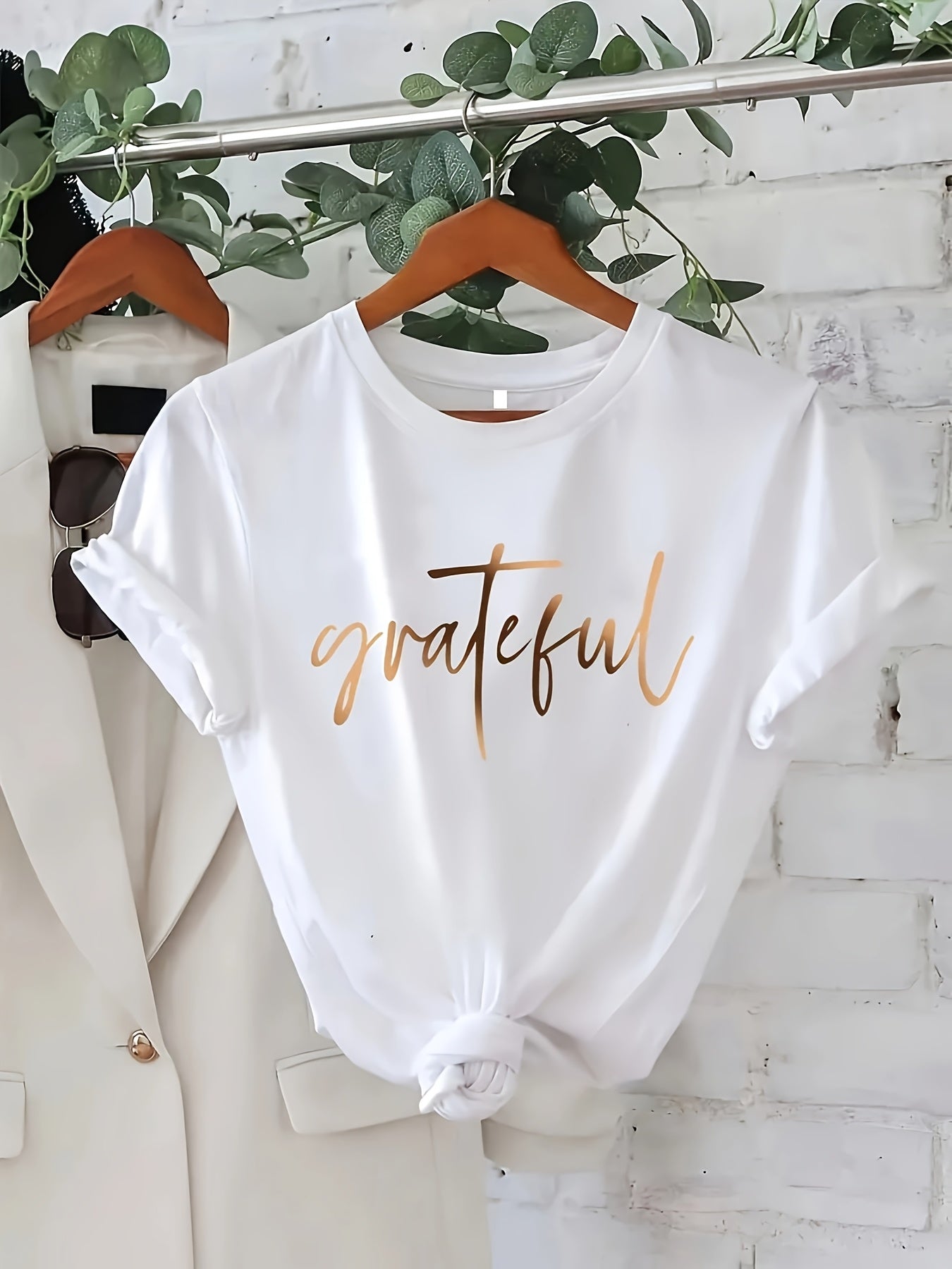تي شيرت نسائي "شكراً" - قميص قصير الأكمام برقبة طاقم عادية، أبيض مع حروف ذهبية مطلية بالفول، بلوزة متعددة الاستخدامات لجميع المواسم، تي شيرت شكراً