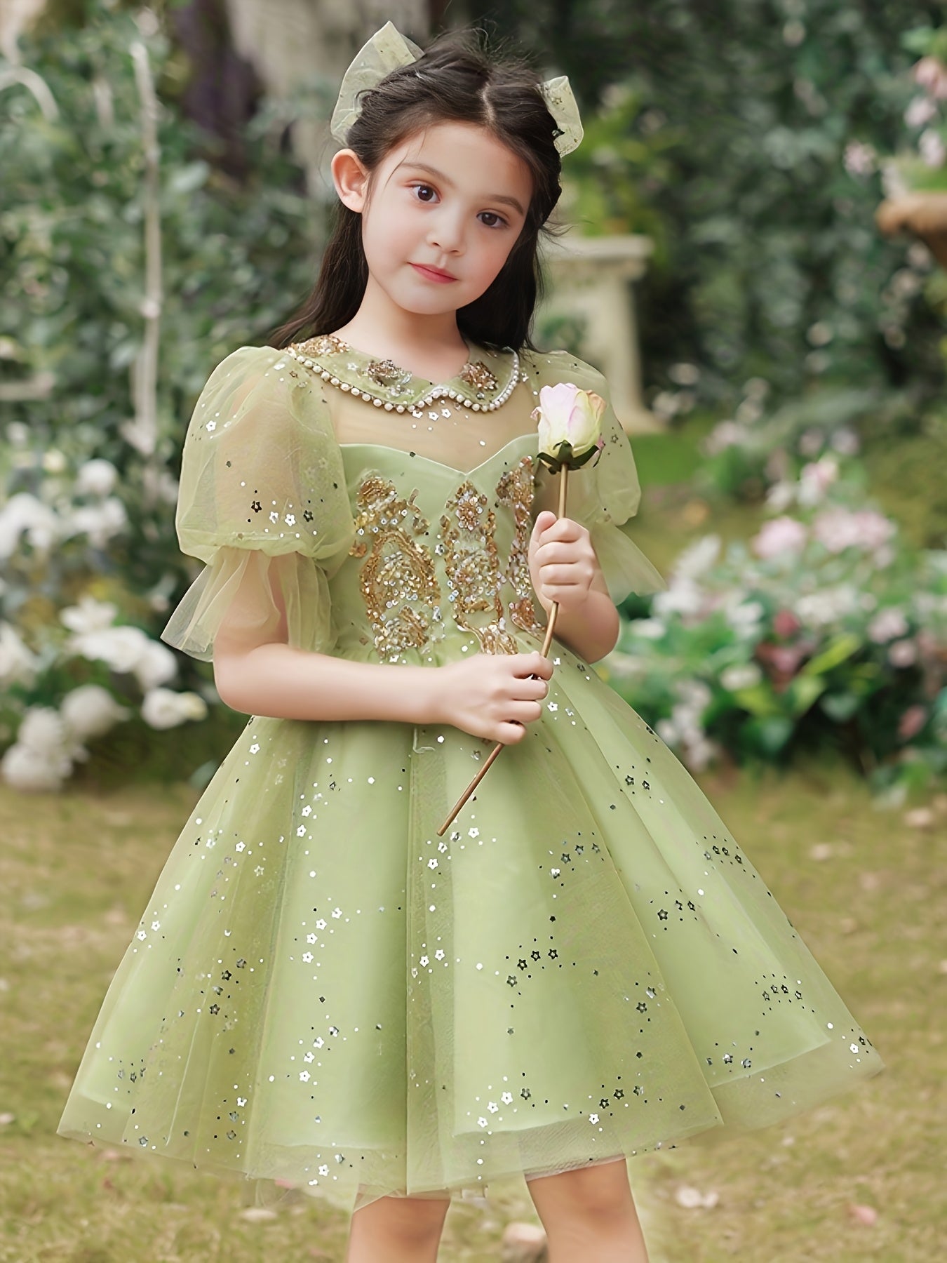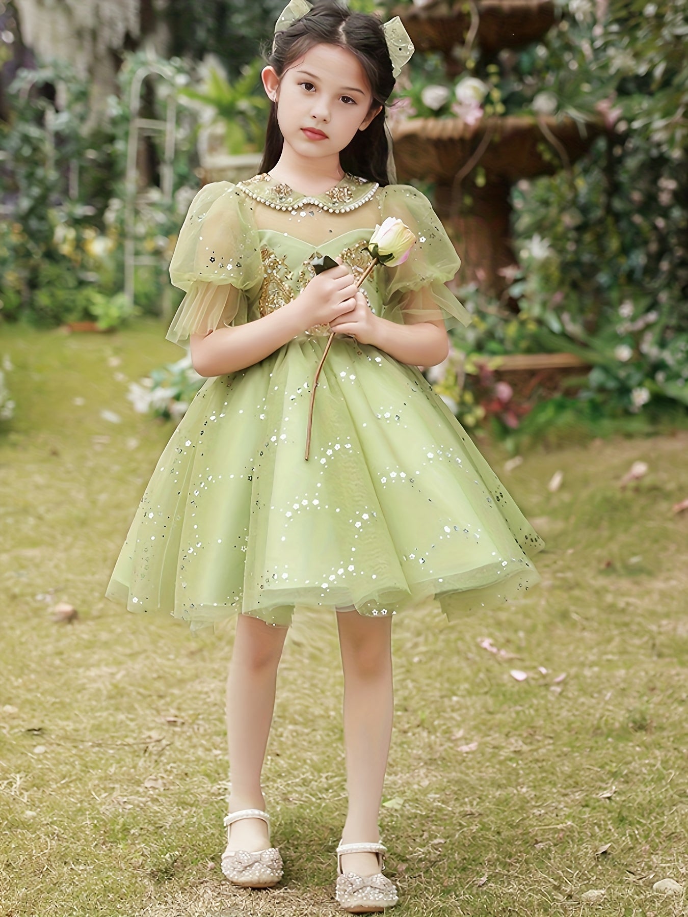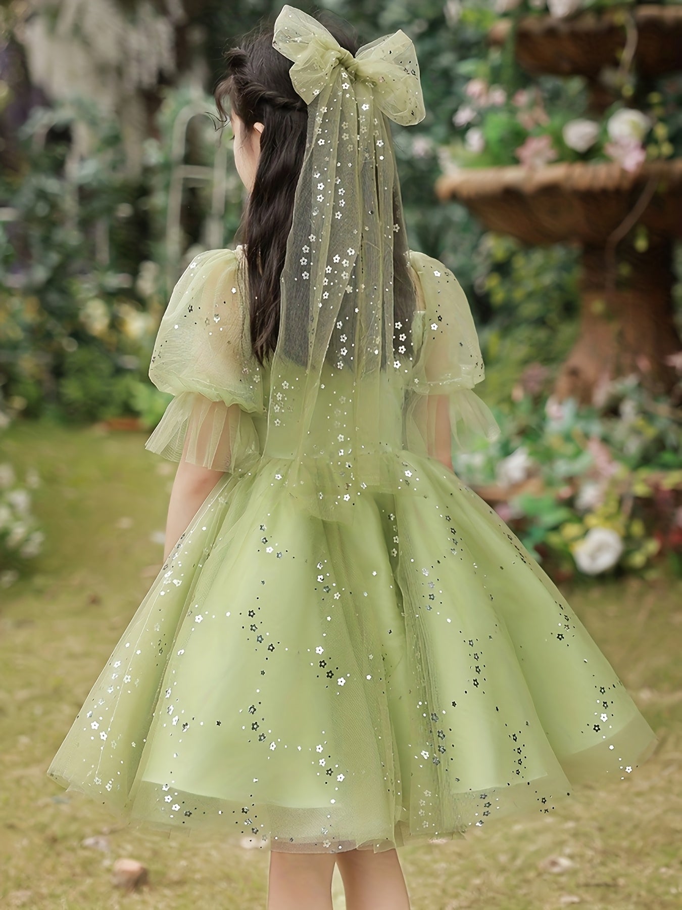 زي الأميرة الأخضر الشاب، بأكمام قصيرة، بتصميم واسع، مطرز بالزهور، فستان حفلة صيفي بتفاصيل القوس، تصميم A-Line، من البوليستر، مثالي للاحتفالات بعيد الميلاد للشباب، فستان حفلة مطرز بالزهور، فستان حفلة من البوليستر