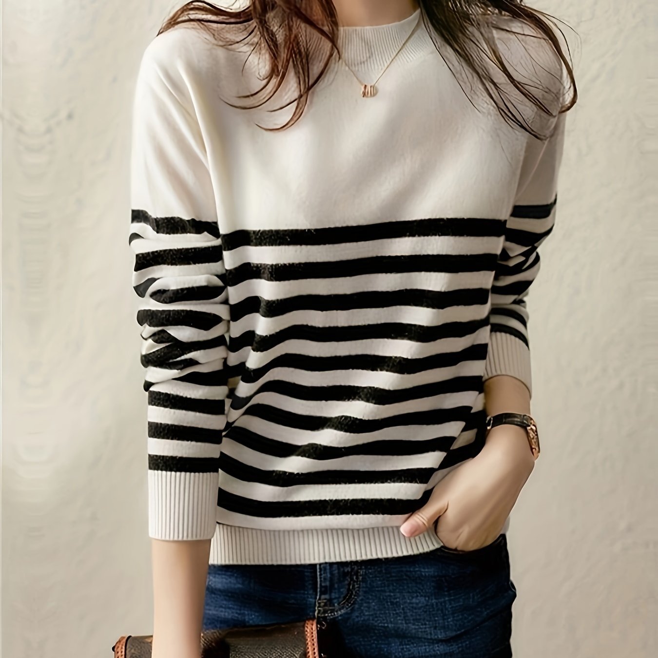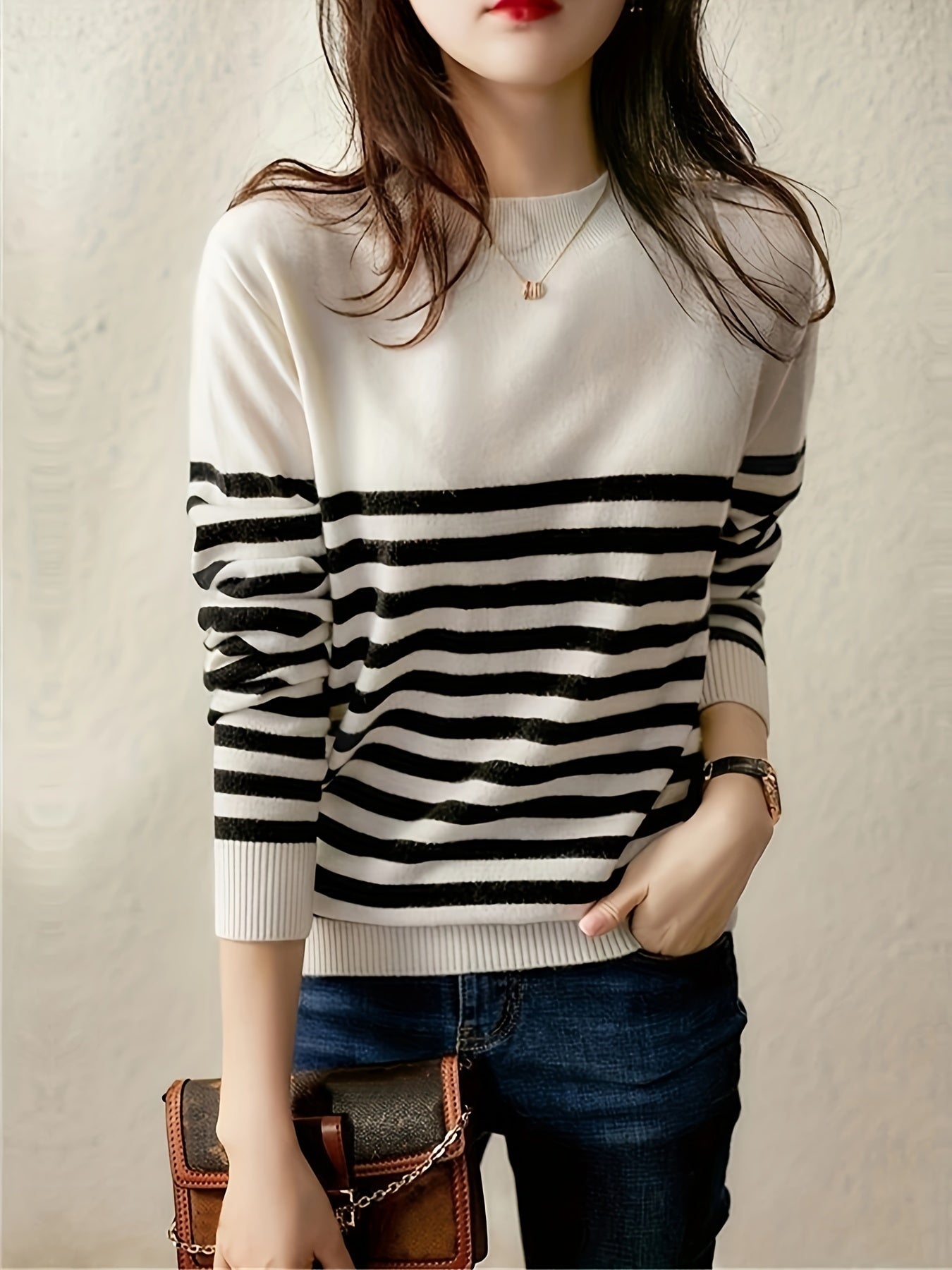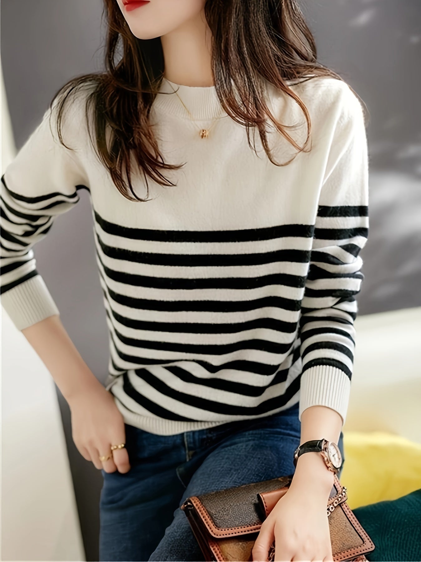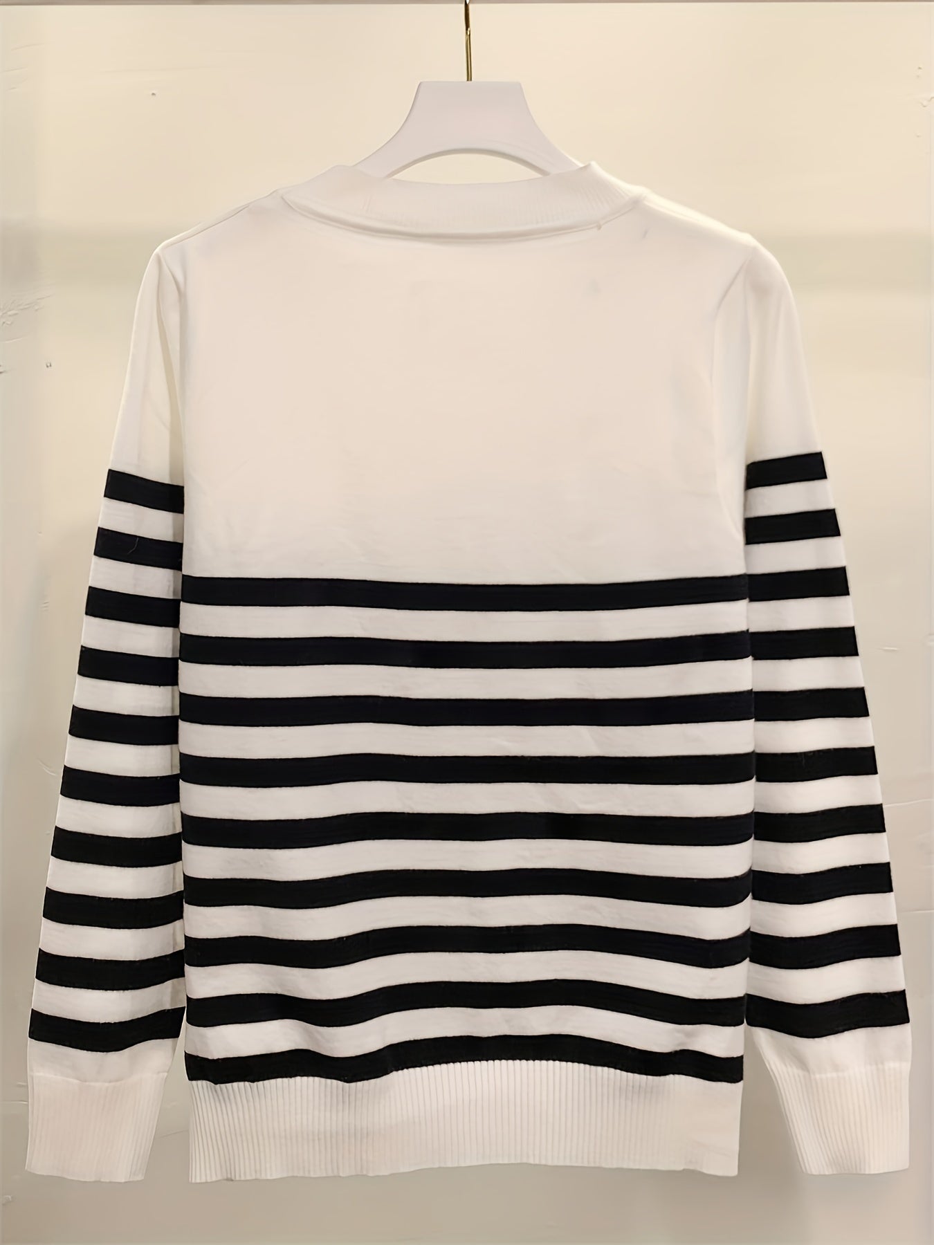 سترة بياقة طاقم مطبوعة بتصميم مخطط، سترة كاجوال محبوكة طويلة الأكمام، ملابس نسائية