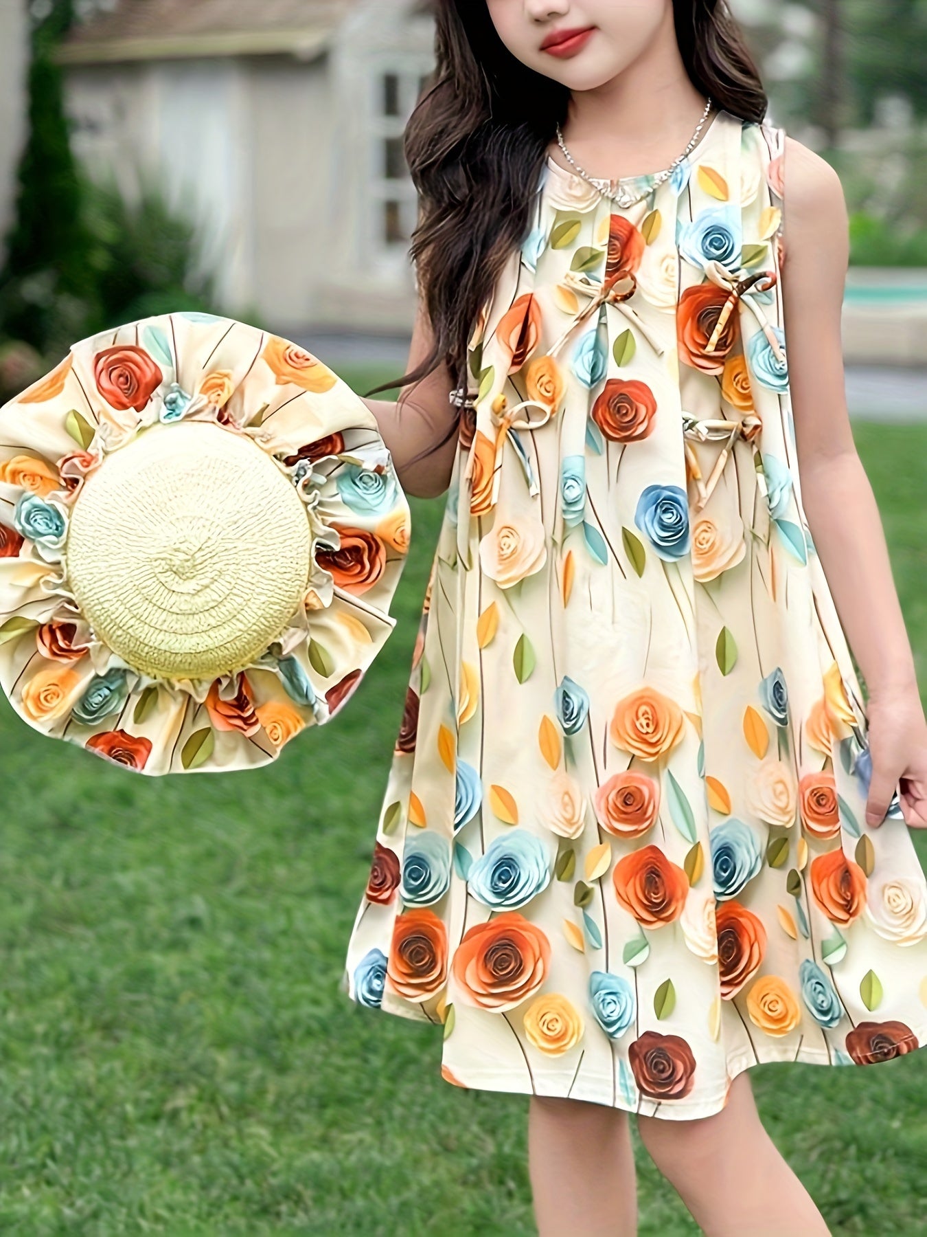 فتيات أنيق ومريح بدون أكمام بأكمله زهور زاهية نمط القوس ديكور Applique فستان مع قبعة لقضاء عطلة صيفية ، 2 قطعة