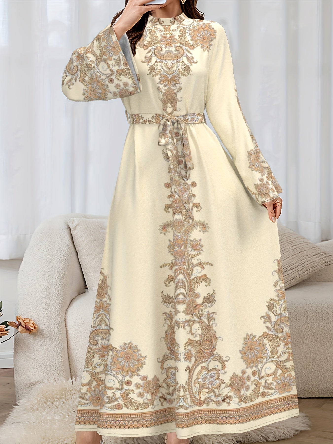 فستان طويل بأكمام طويلة وياقة عالية وطبعة شرق أوسطية وحزام خصر