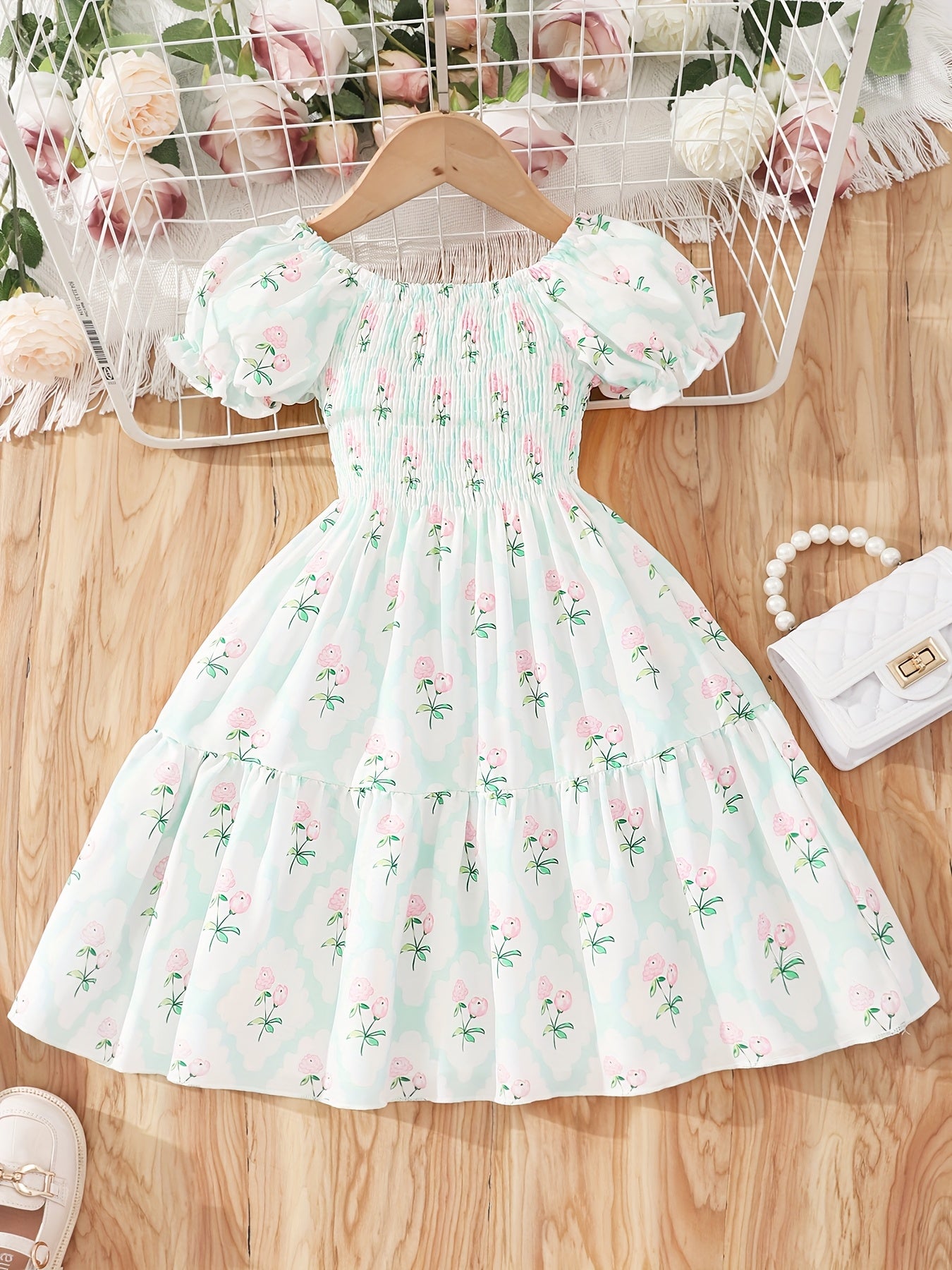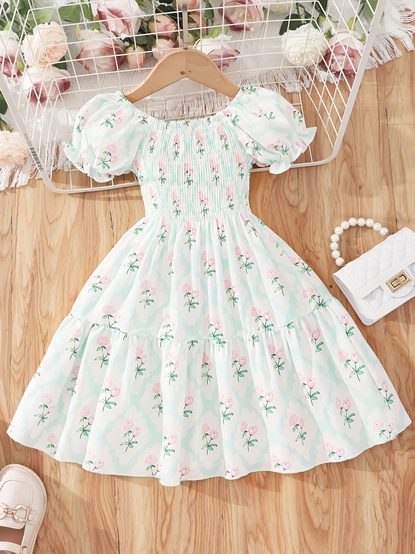 فستان قصير الأكمام بطبعة زهور بوهو، طول الركبة، نسيج قابل للتمدد قليلاً، تفاصيل مجمع، بدون حشوة، مقاس عادي، للفتيات، الصيف