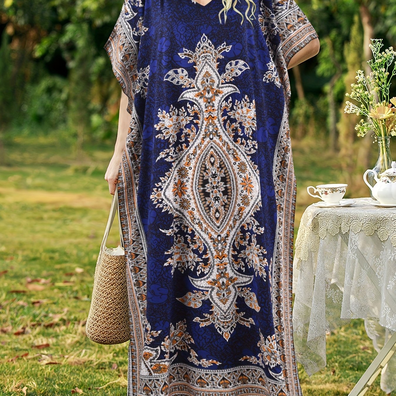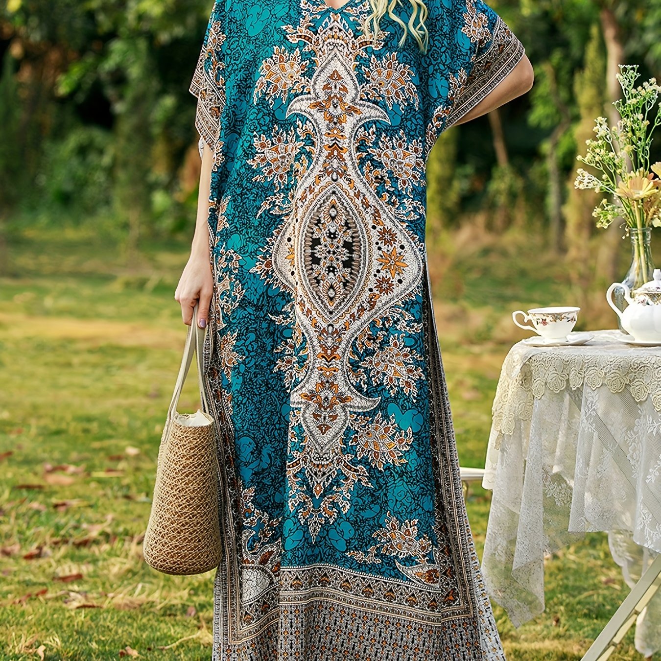 فستان قطعة واحدة برسومات رمضان، بأكمام قصيرة وياقة على شكل V، لفصل الربيع والصيف، ملابس نسائية