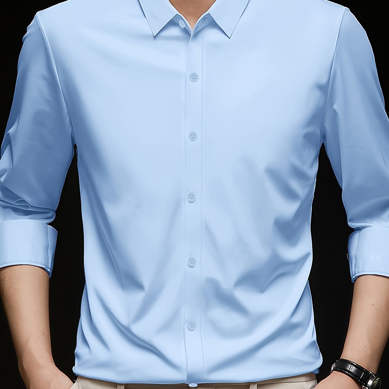 قميص رجالي أسود أنيق - بأكمام طويلة، لون سادة، خليط بوليستر خفيف، مثالي للارتداء اليومي