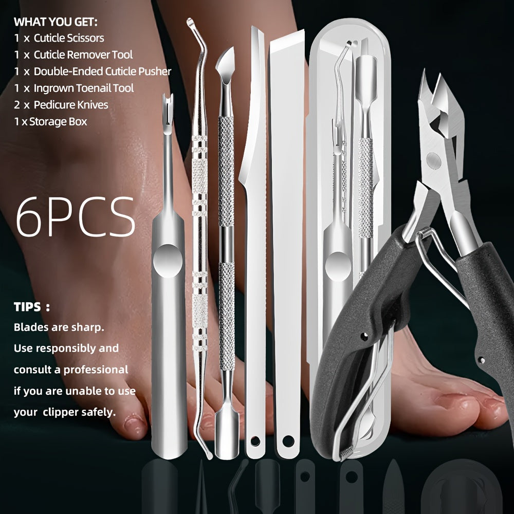 مجموعة من 6 قطع من مقص بشرة الأظافر مع أداة دفع للزوائد اللحمية، وسكاكين الباديكير، وأدوات العناية بالأظافر، ومجموعة العناية بالأظافر للبشرة الميتة. مزيل جل طلاء بالأشعة فوق البنفسجية - مثالي للعناية الاحترافية بالأظافر.