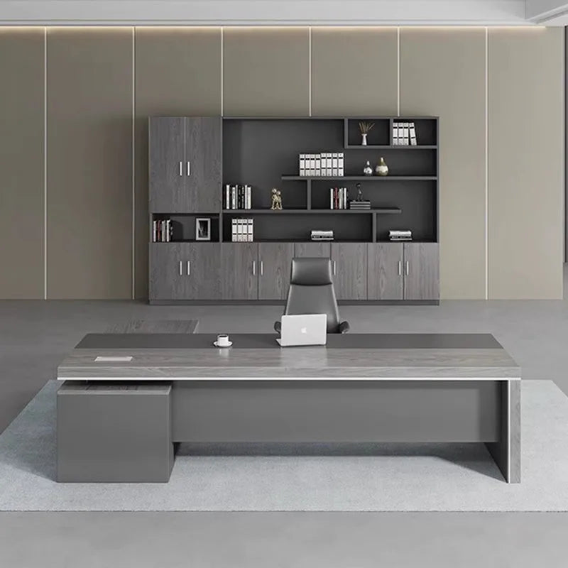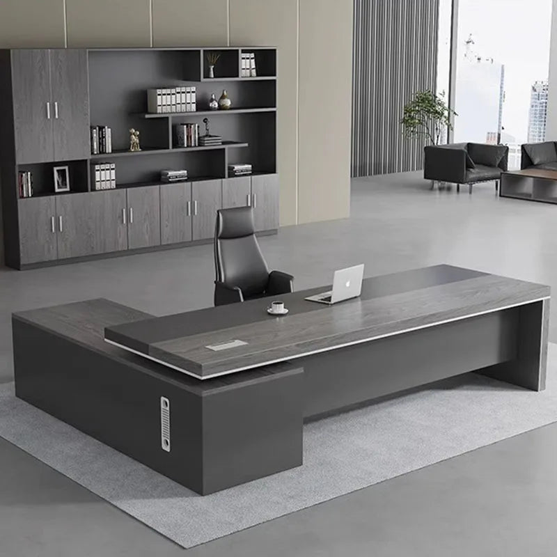 مكتب استقبال بسيط على شكل حرف L ، عمل تنفيذي للألعاب ، طاولات مؤتمرات عتيقة ، أرفف ، طاولة كمبيوتر محمول ، كتابة ، مطبخ