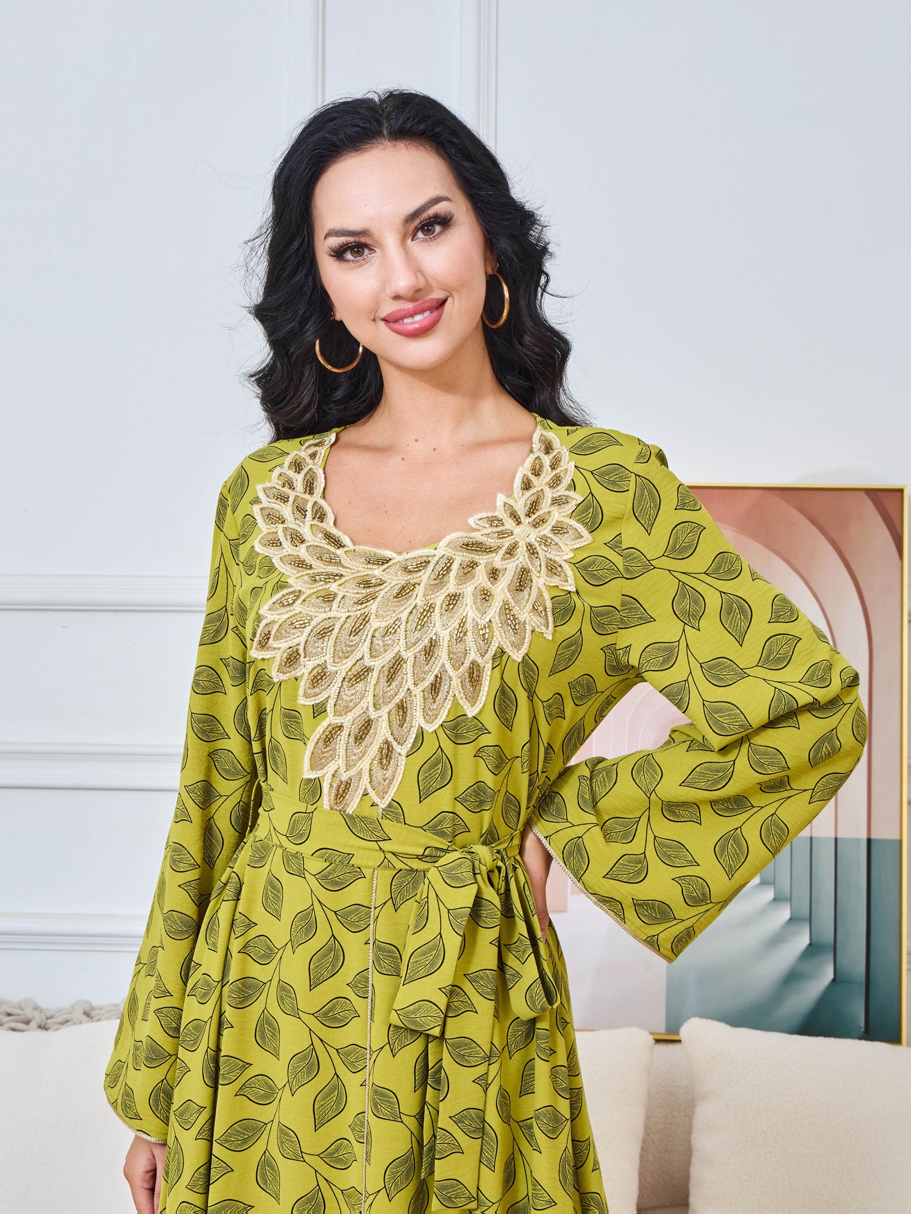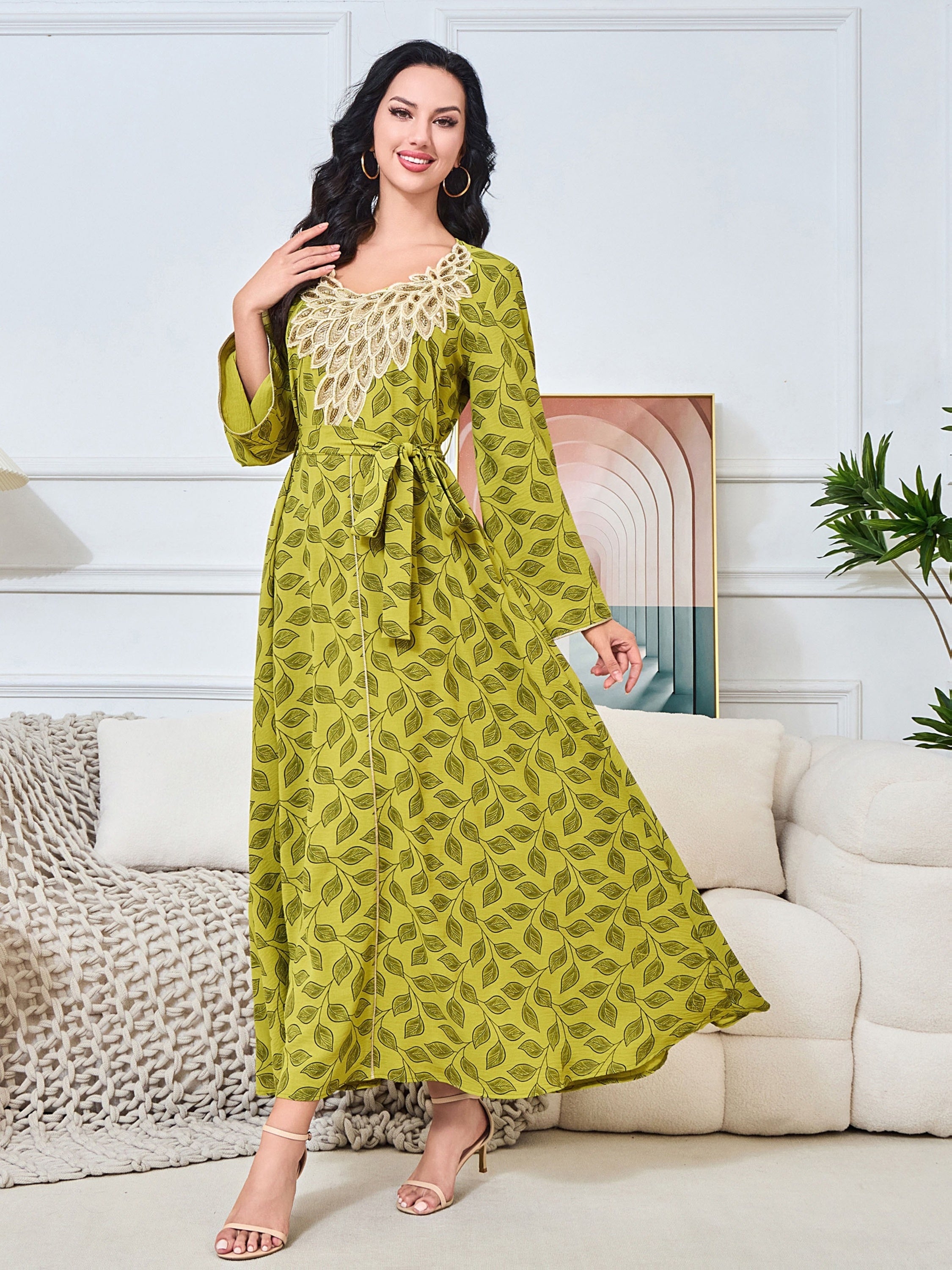 فستان نسائي طويل بطبعة أنيقة برقبة مستديرة - موضة الشرق الأوسط لخريف وشتاء