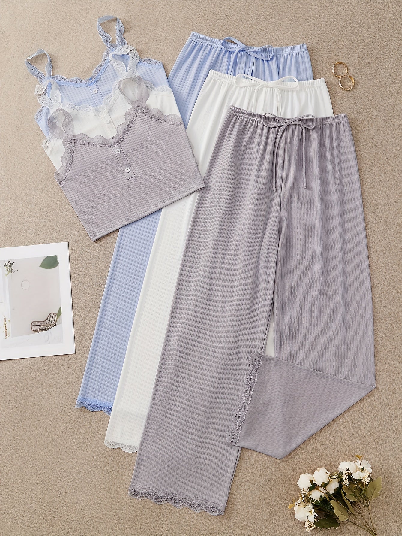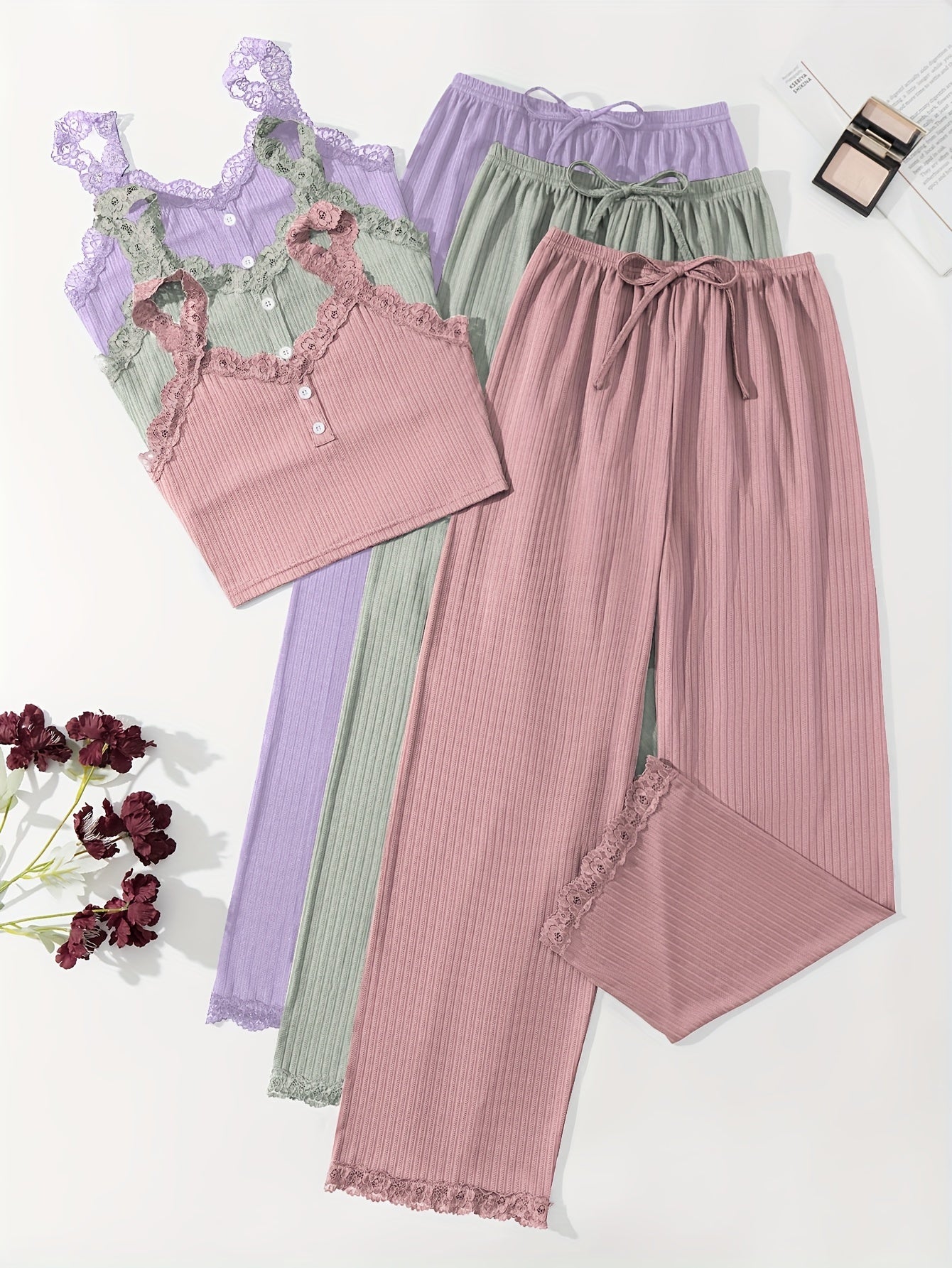 مجموعة نسائية مكونة من 3 قطع، تتميز بتصميم ملائم ومريح، مع تفاصيل دانتيل وأزرار، وقمة كامي قصيرة مع ياقة دائرية وبنطلون