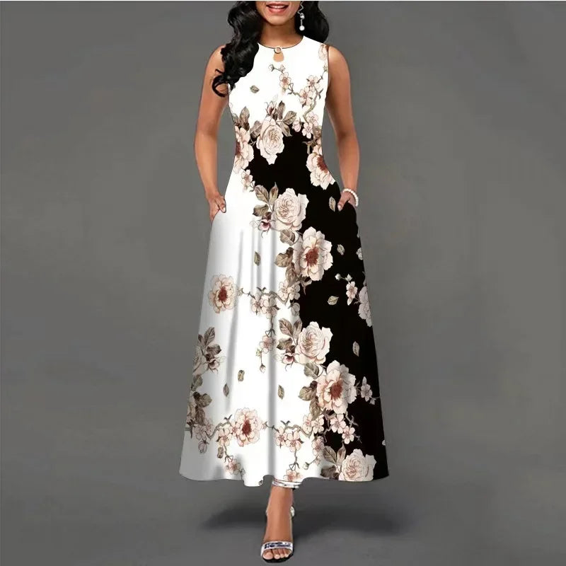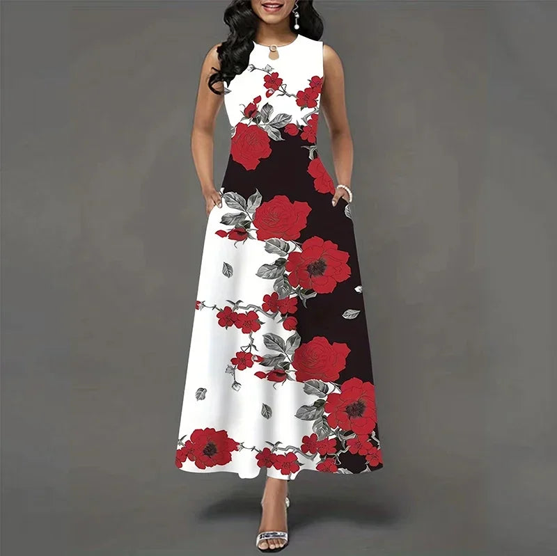 تنورة بدون أكمام بطبعات زهور للسيدات، تنورة جيب على شكل حرف V